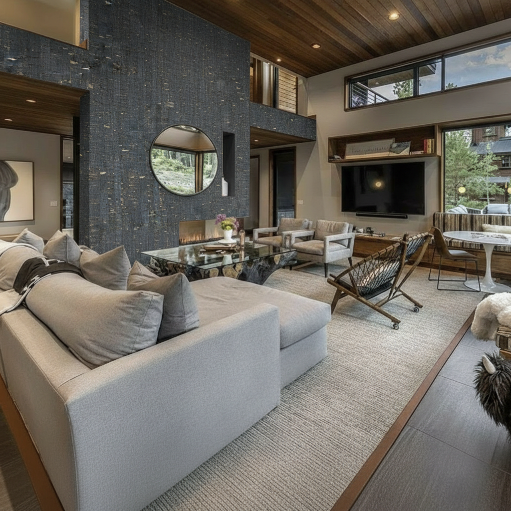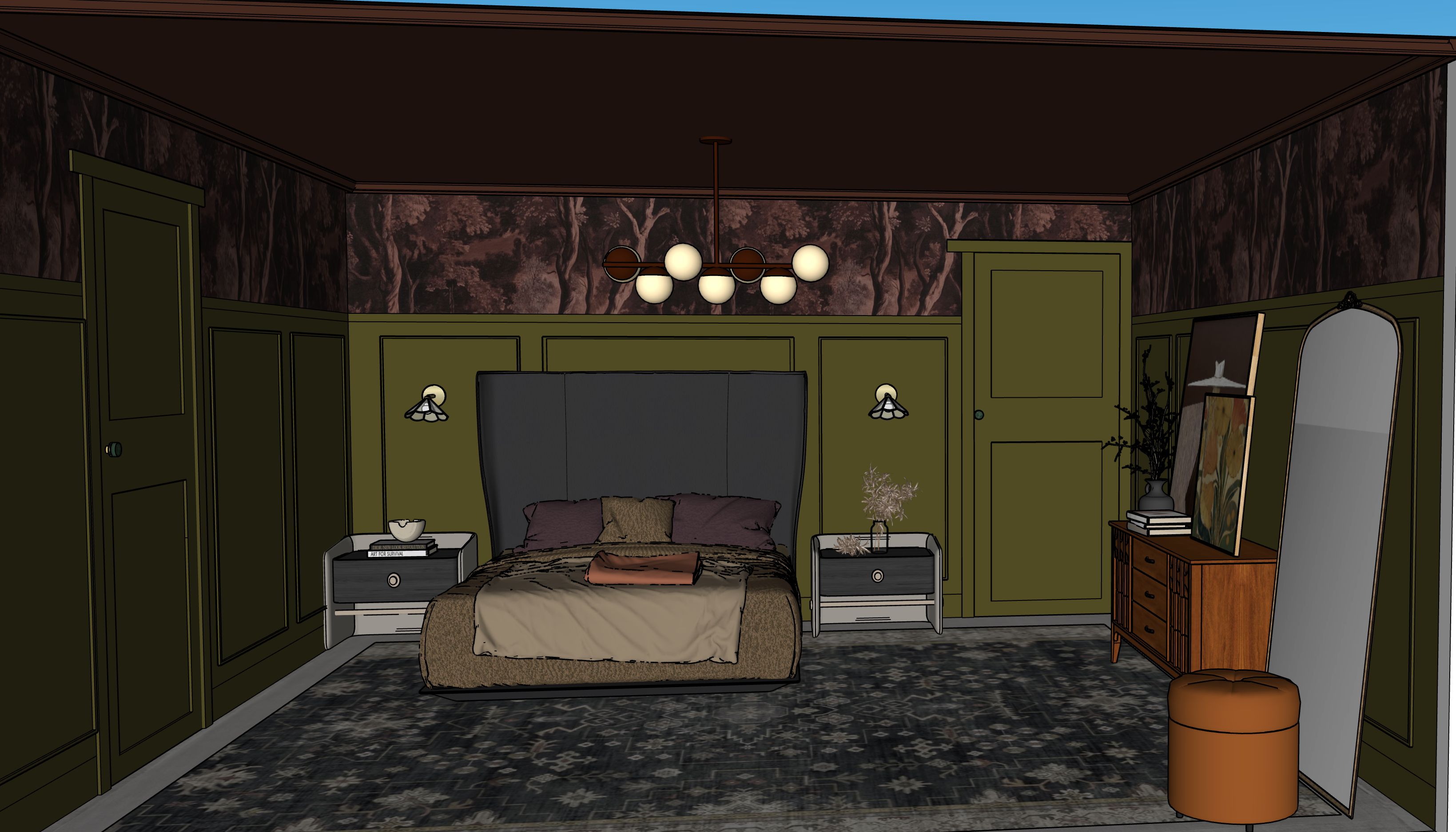 use this exact image as the base do not change room layout and architecture door locations and proportions ceiling height and trim details furniture placement and scale apply the following design and atmosphere changes color materials deepen the green wall color to a richer moodier olive tone slightly darker more saturated velvety finish add subtle satin or matte enamel sheen to paneling for depth darken the ceiling to a deeper more dramatic oxblood aubergine tone rich enveloping not flat slightly blend ceiling color into upper wallpaper line for a cocooning effect enhance wallpaper to feel more tonal and atmospheric slightly darker more contrast in trees soft misty depth romantic almost painterly lighting convert lighting to low warm ambient lighting 2700k or warmer dim overhead fixture so globes softly glow not bright white add warm pools of light from sconces create shadow and contrast in corners not evenly lit add subtle indirect lighting glow behind headboard or near wall edges for depth furniture textures deepen bedding tones rich taupe cocoa and muted plum layering add heavier texture linen velvet or soft matte finishes slightly darken rug tones and increase contrast so it grounds the space add subtle sheen to wood tones on dresser richer warmer slightly deeper finish styling add soft romantic styling elements slightly more layered pillows a draped throw with natural folds minimal but intentional accessories keep styling refined and not cluttered atmosphere introduce soft shadowing throughout the room add slight vignette effect darker edges brighter center overall tone should feel moody romantic intimate editorial luxury interior magazine overall style direction romantic moody bedroom european inspired slightly vintage warm layered and emotionally rich