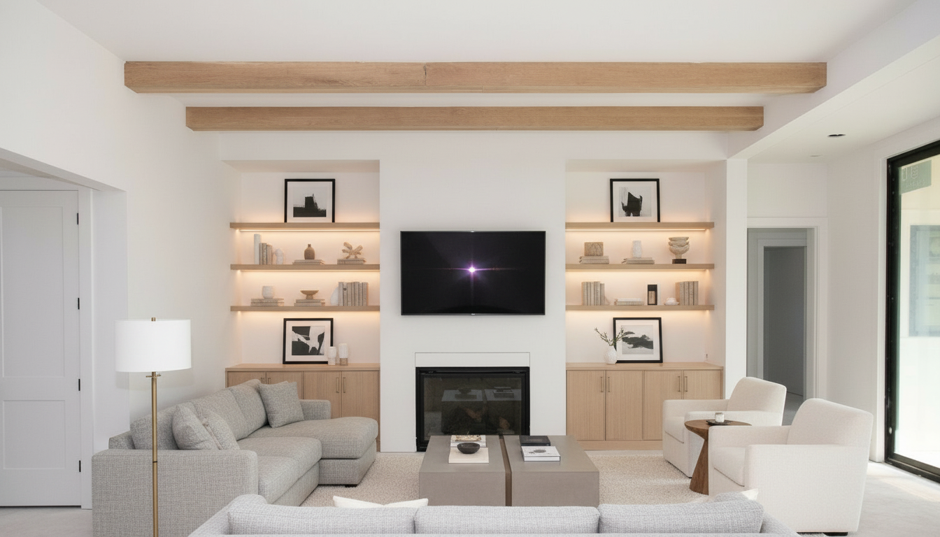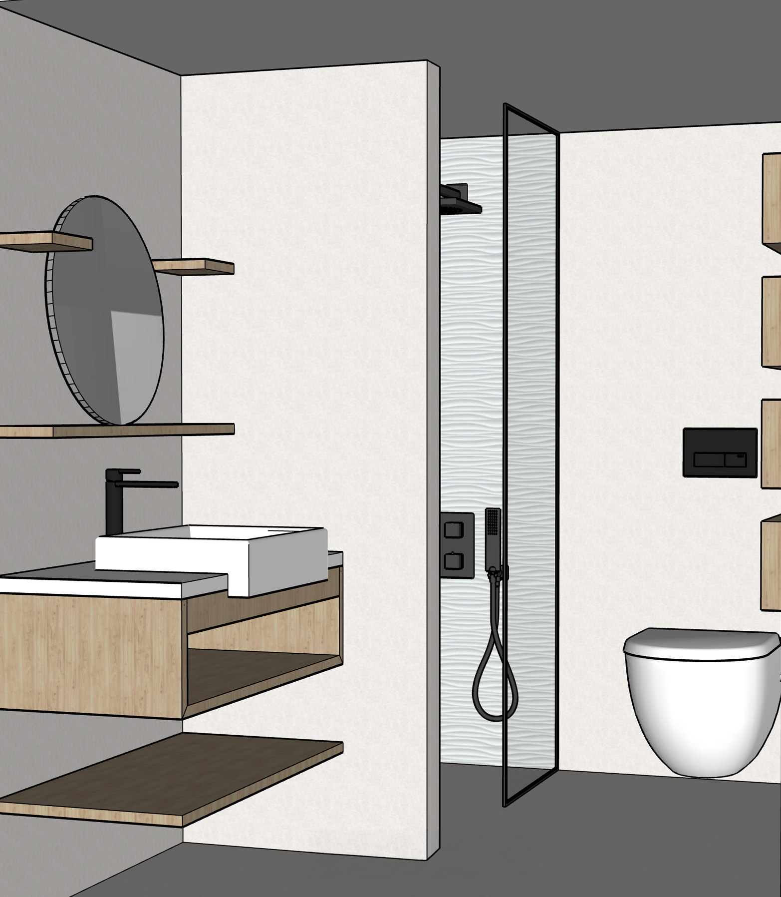 photorealistic interior render of a modern luxury bathroom maintain the exact layout proportions and geometry from the reference image use realistic architectural lighting with soft natural daylight and subtle ambient reflections high end materials with accurate textures polished marble wall panels matte black fixtures warm wood vanity wave tile used for the shower back splash and brushed gold metal mirror clean minimal contemporary aesthetic sharp focus professional architectural visualization real world scale no design changes