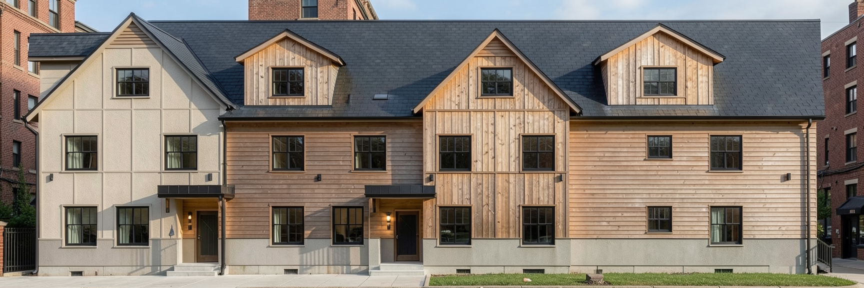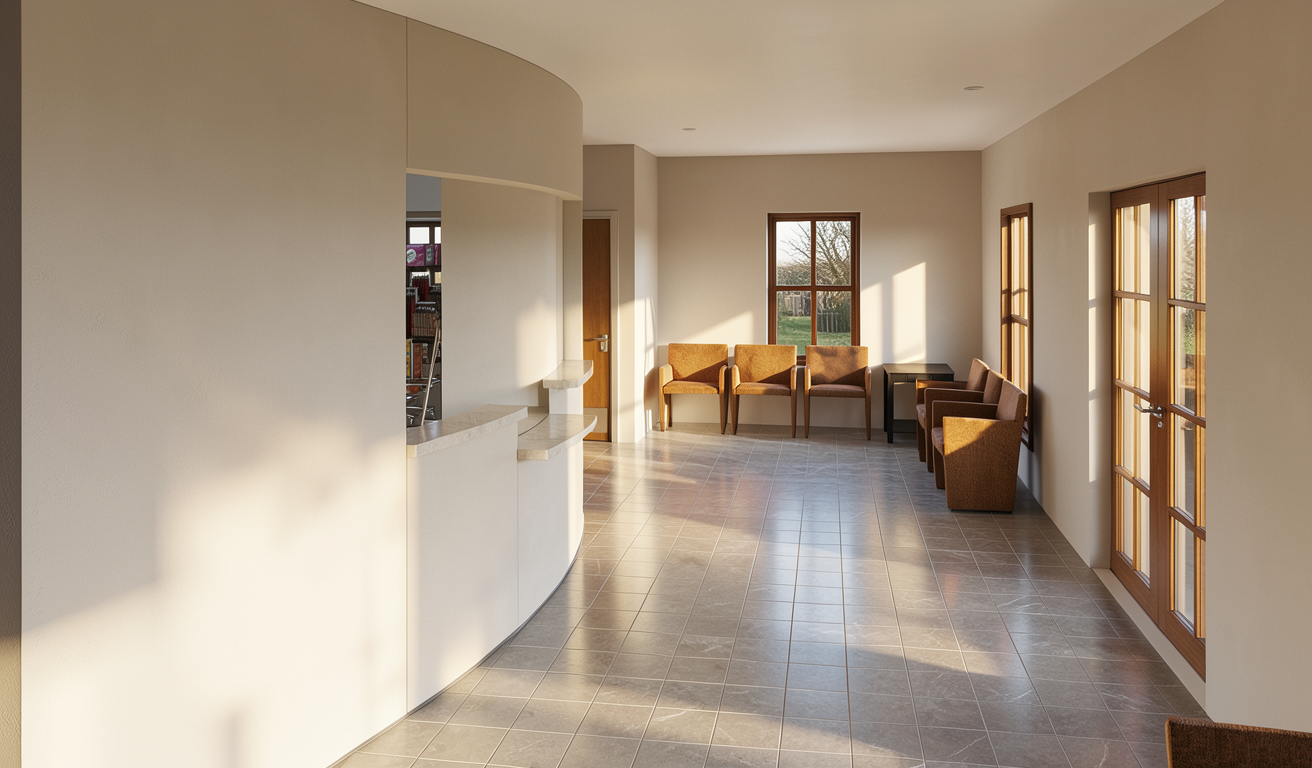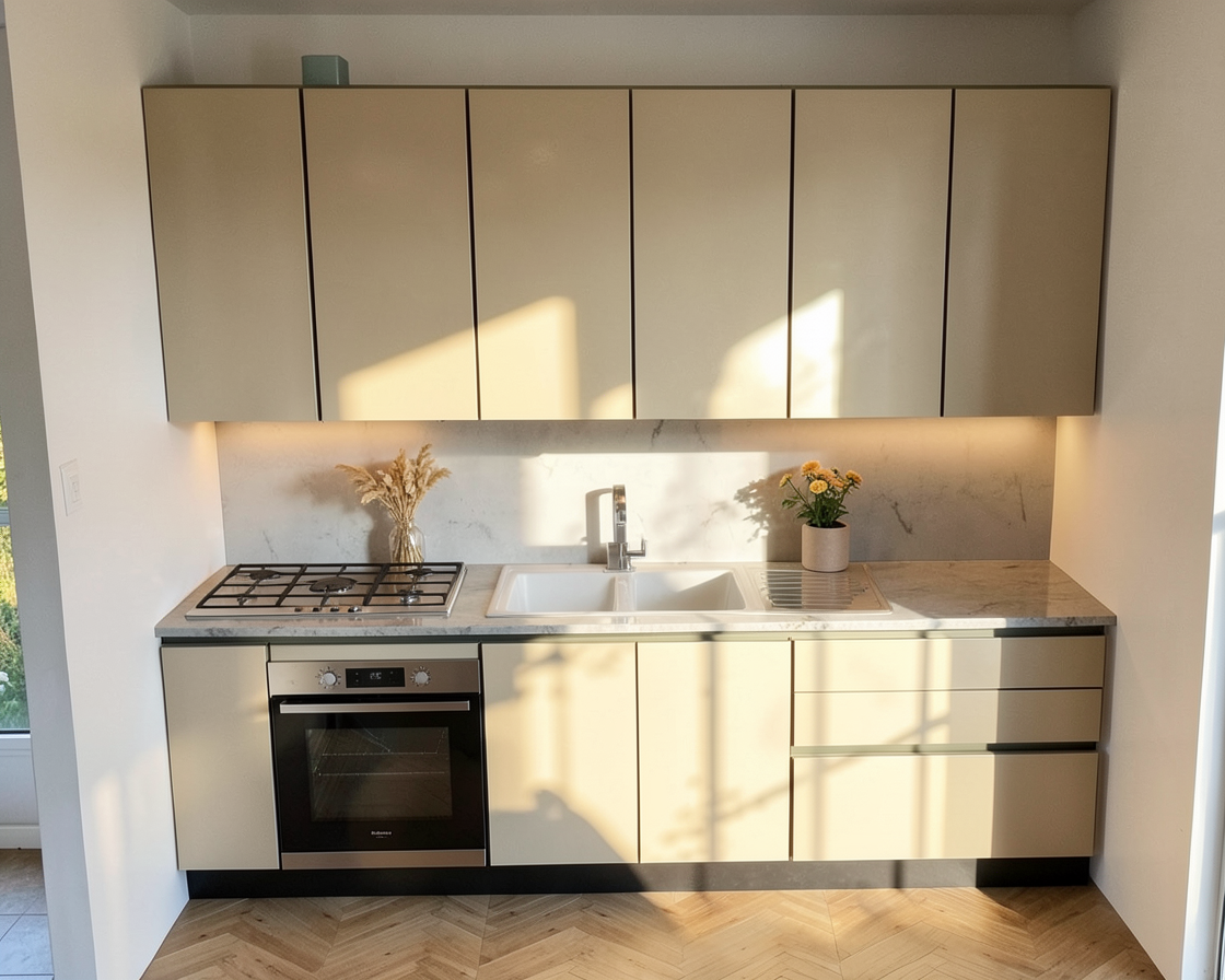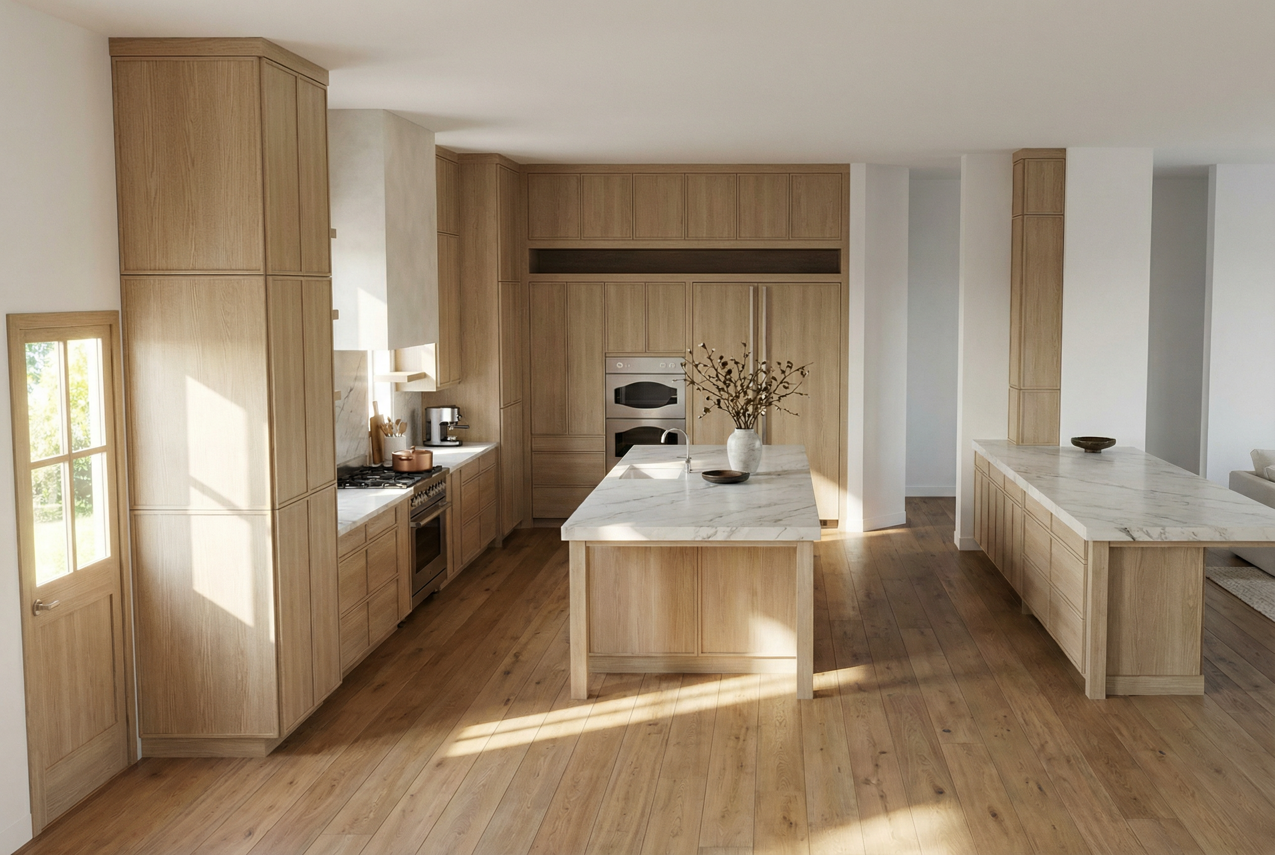 create rendered aerial floor plan with warm neutral floor plan white king bed at bedroom white sofa and club chair at living room green turf at golf simulator white marble floors and glass shower enclosure inside bathroom only kitchen has white marble countertops and stainless steel refrigerator warm medium wood flooring white draperies with geometric pattern at the windows and niches along the top wall