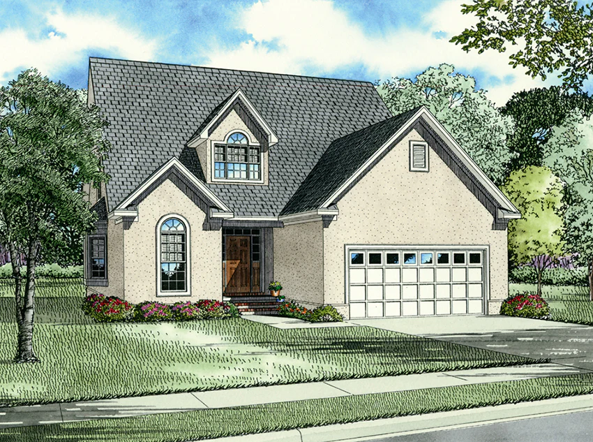 create real high resolution photo with plush trees and bushes with vibrant sky keep all details exact as original match existing colors match details exact match all architectural details exact eifs colors to be off white color of garage doors and fornt doors to be a taupe