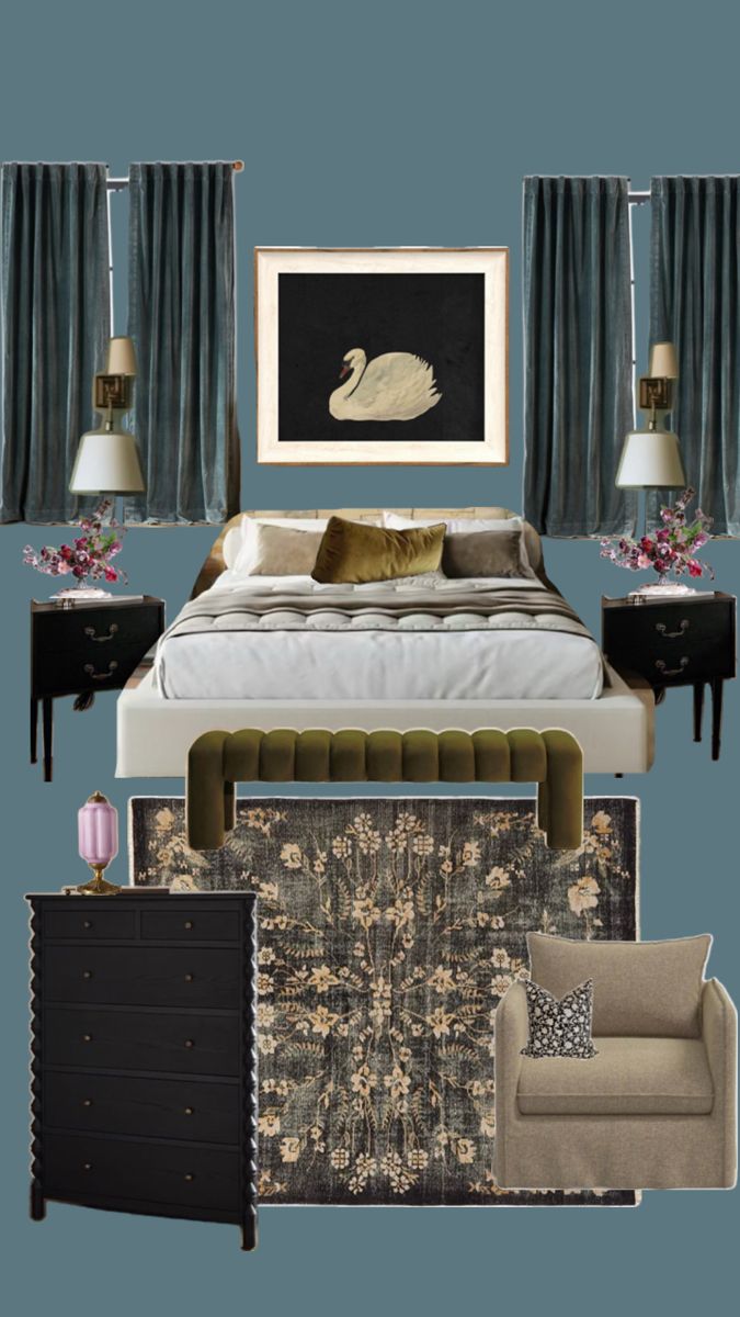 prairie style interior shot render a luxurious vintage bedroom with a classic atmosphere the walls are painted in a french blue a grand cream upholstered bed frame with crisp white linens is accented with plaid cushions a brown leather pillow and a plush duvet comforter at the end of the bed a large ornately framed painting of a goose adds sophistication vintage black nightstands with brass wall sconces elegantly flank either side of the bed at the end of the bed an olive green channeled bench sits with a black wood chest and spool leg details nearby a plush beige armchair offers comfort complemented by a small prairie floral pillow sits in the space the floor is adorned with a detailed persian rug in muted warm tones of black blue green and beige include fresh florals enhancing the rustic charm the lighting is soft architecture