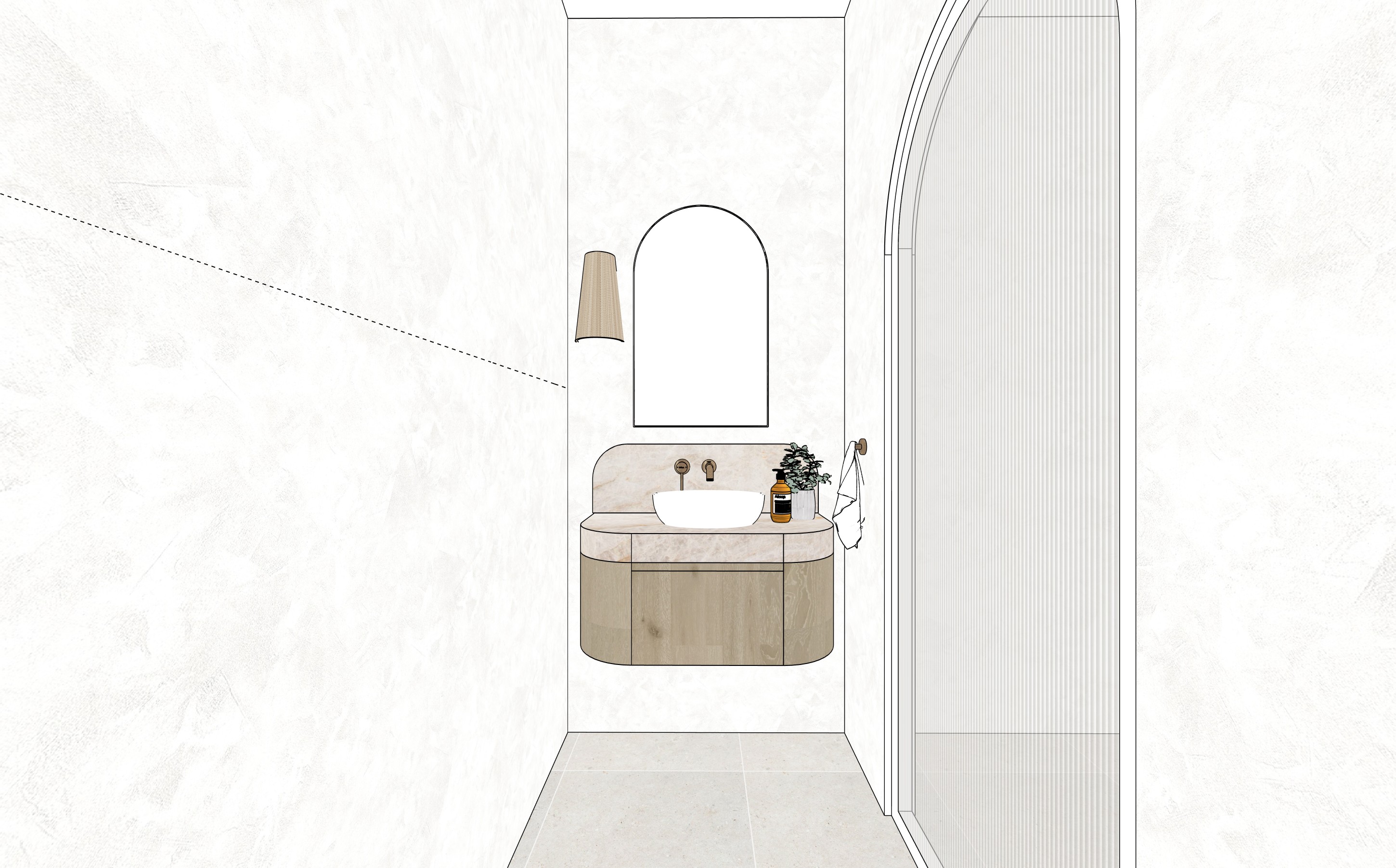 antique brass tapware tone taj mahal stone light oak cabinet white frame mirror styling decor light colour micro cement walls rattan woven wall sconce white frame door