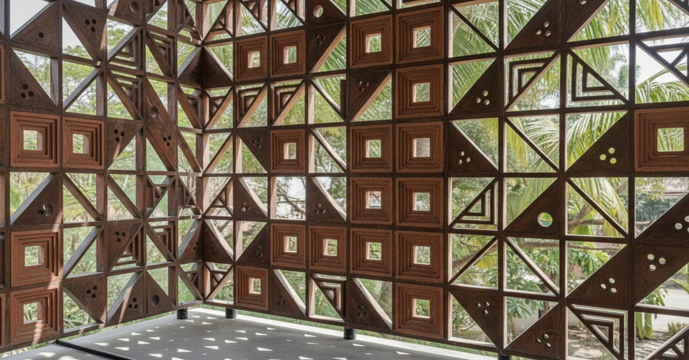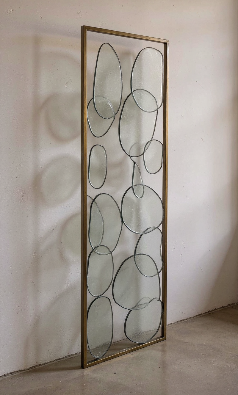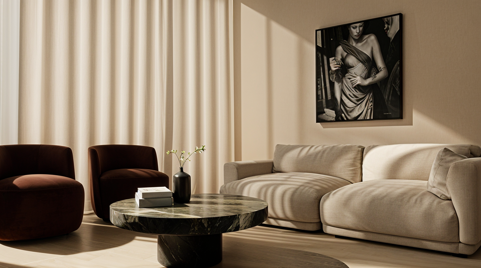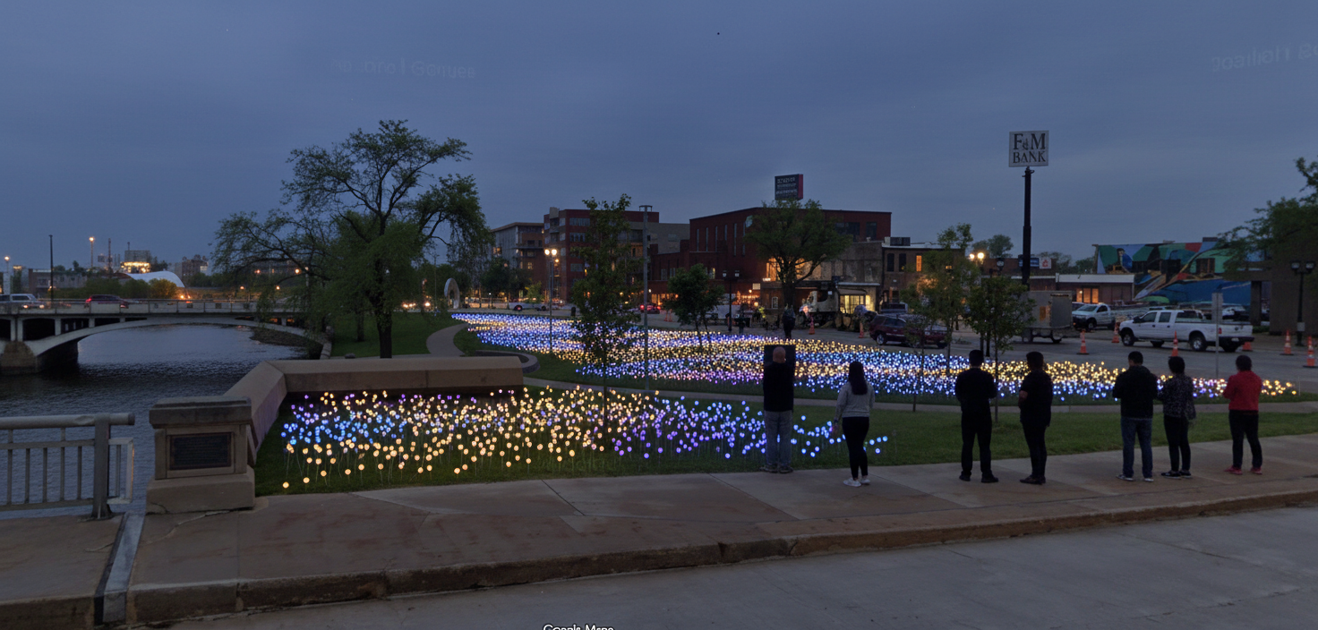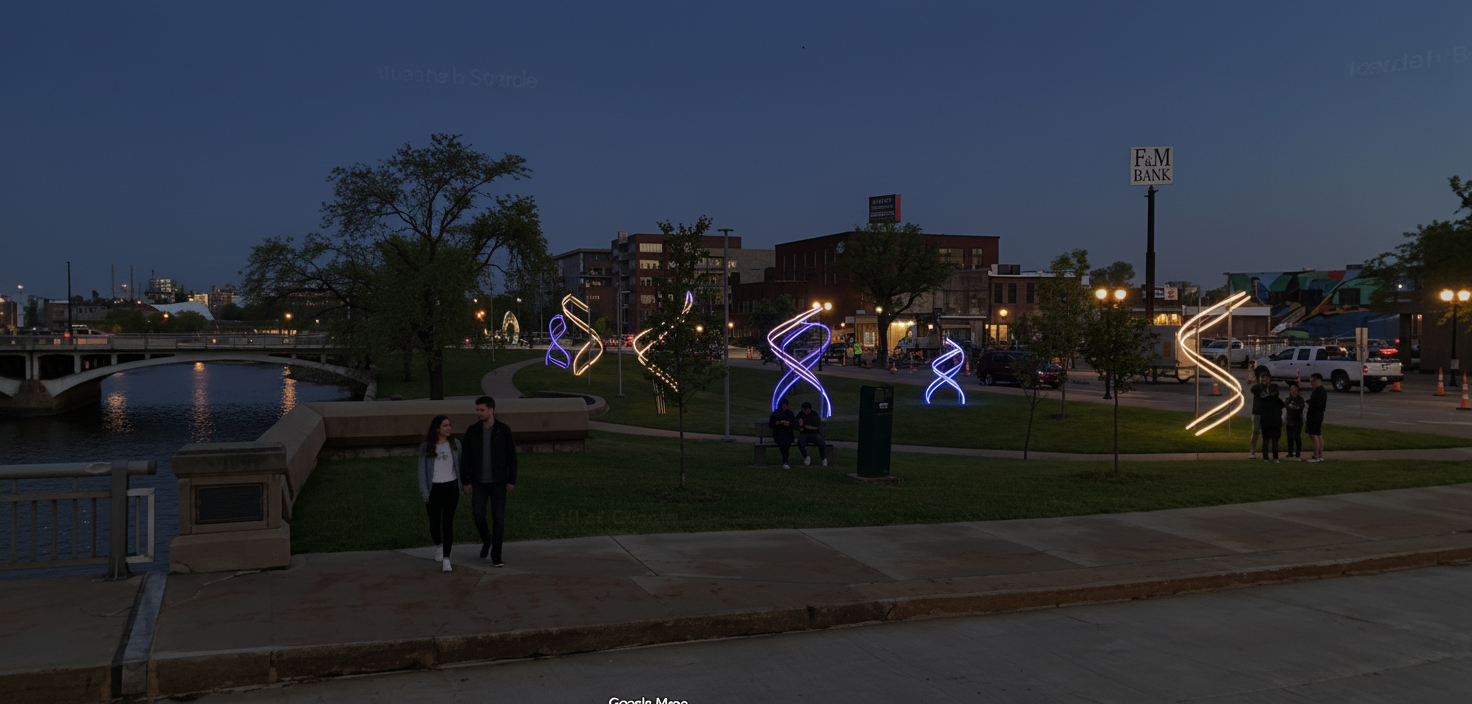 make a dark evening scene with light sculptures along the sidewalk between the lawn spaces add people