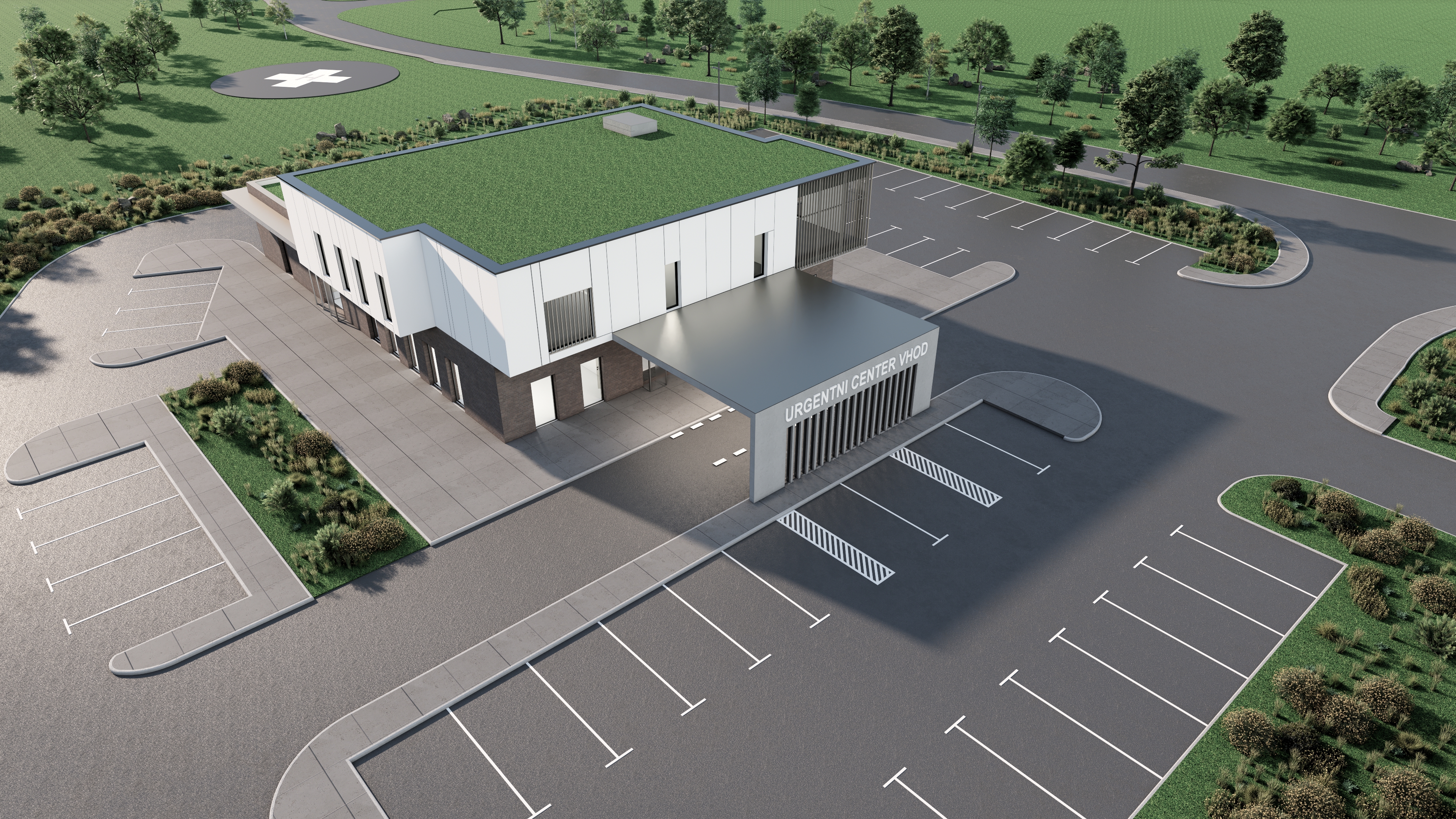 keep the pavement the same in concrete clouds in the sky lots of greenery and trees preserve all existing text on signs and surfaces grey reflections in the windows bright entrance audi a 6 and marcedes on the parking sunlight coming in architecture