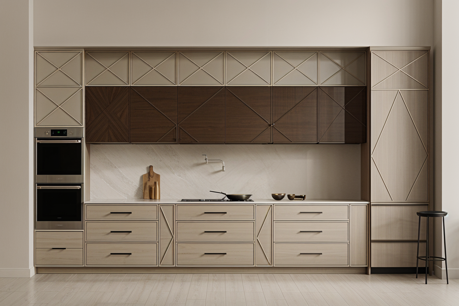 modernist interior shot wooden ceiling stone floor bright and warm big windows green background outside business lunch kitchen countertop in the front ad some pendant lamps architecture