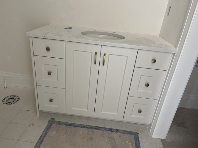 do not change the cabinets in any way preserve the exact cabinet colors materials finishes dimensions door and drawer styles hardware spacing alignment and all geometry exactly as shown do not alter the countertop shape backsplash appliances flooring lighting fixtures or wall structure only remove the construction materials clutter and mess from the scene clean the room and make it look finished and staged add a few simple tasteful home accessories appropriate for the style of the space but do not add or remove any furniture windows or architectural elements maintain the original lighting direction and realism enhance clarity and polish the photo while keeping the cabinetry and room design completely unchanged do not alter the lighting to keep the cabinet colors as they are in the image add new flooring and faucet add a decorative mirror with lighting stage the countertops for a bathroom vanity