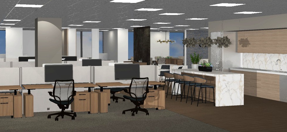 make the rendering look like a high end beautiful office interior with a bright clean ceiling with ceiling grid blue sky in the windows