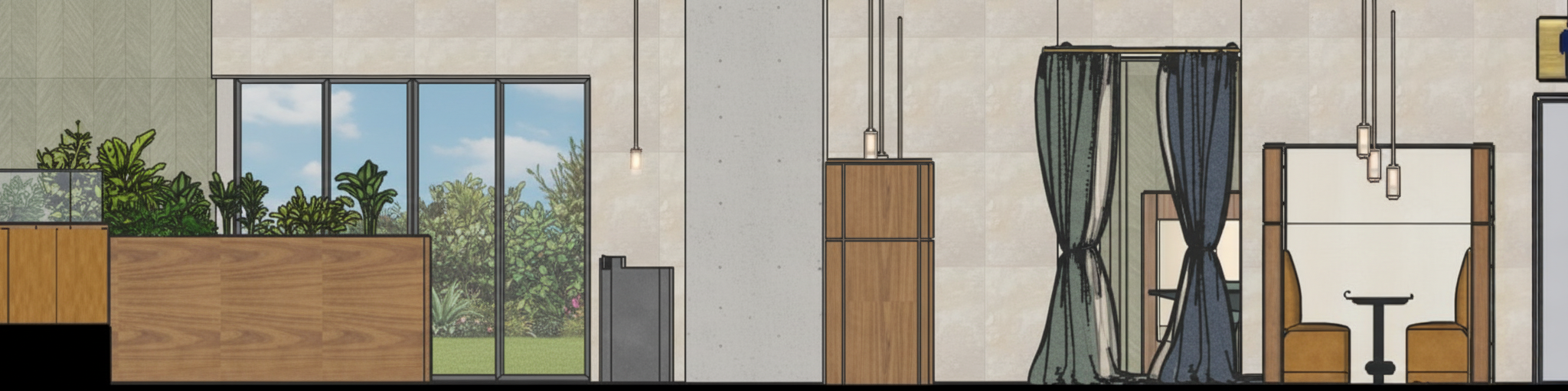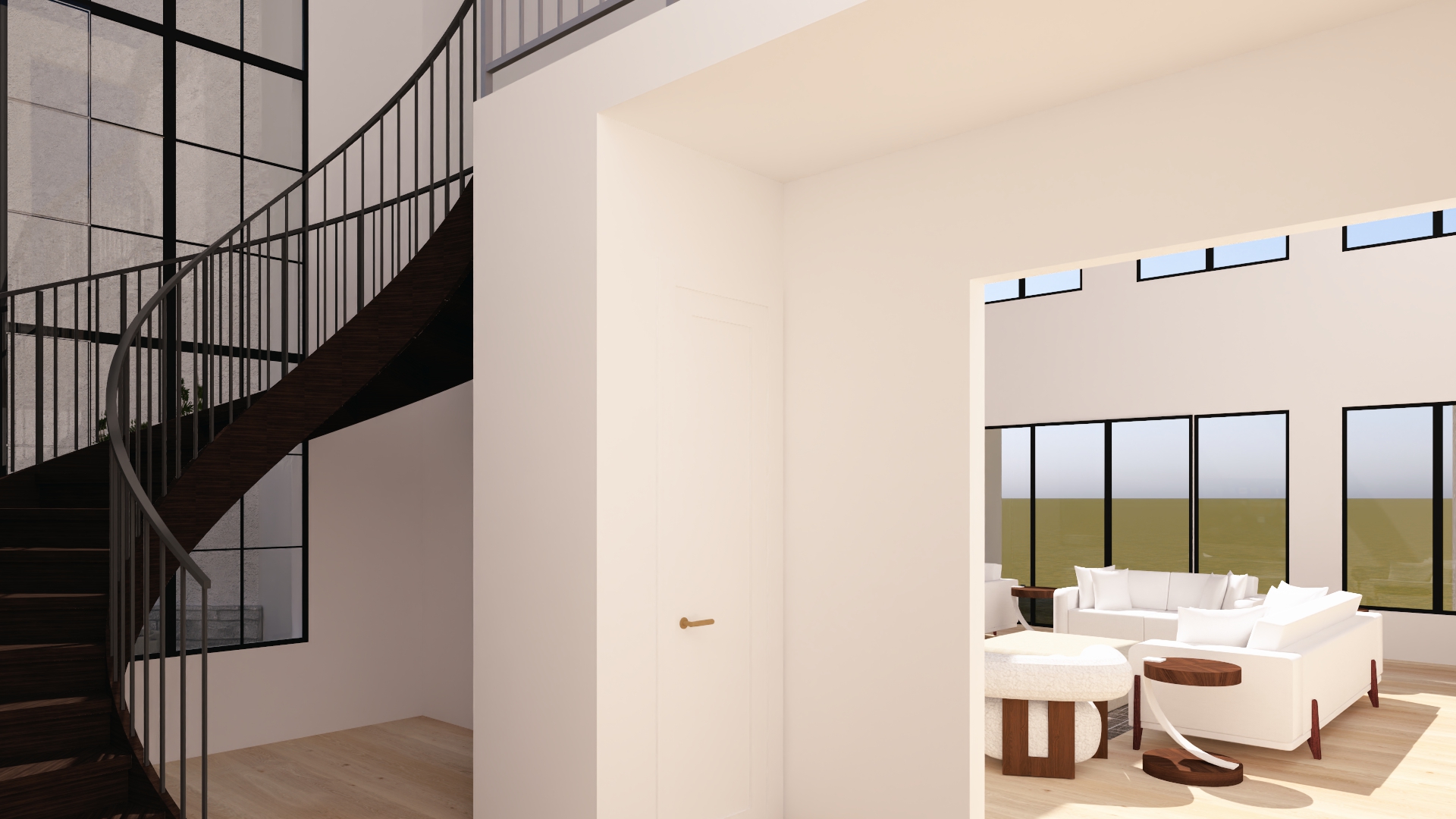 exterior shot a beautifully rendered modern interior featuring an elegant curving staircase with sleek black railings and rich dark wood steps next to a large arched window flooding the space with natural light the walls are a soft cream creating a calming atmosphere outside vibrant green grass stretches beneath a clear blue sky with fluffy white clouds the scene feels open and airy blending modern architectural elements with serene natural beauty adjust to render entire photo