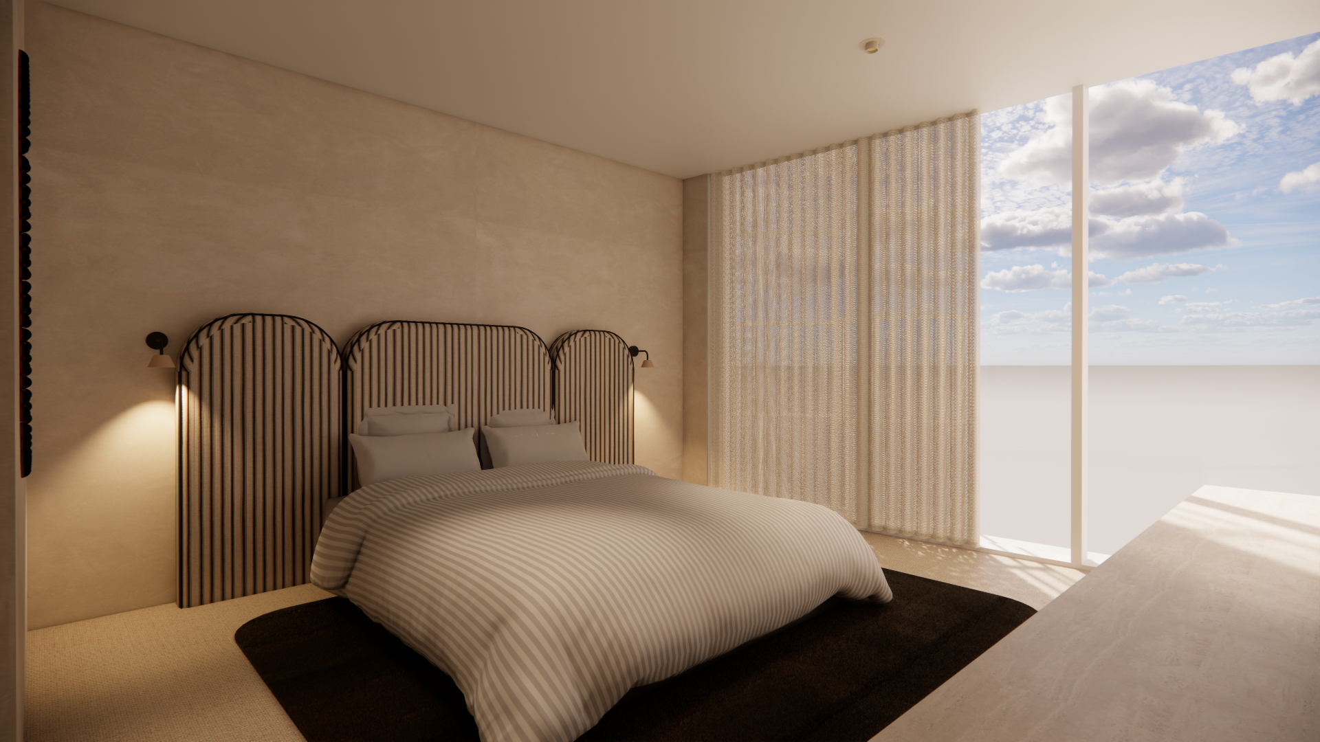 exterior shot use the burl side tables for next to the bed on either side of the bed make sure the drapery is very realistic with it being very soft make the outside an urban context make sure the bed doesnt have blue stripes make it a beige cover
