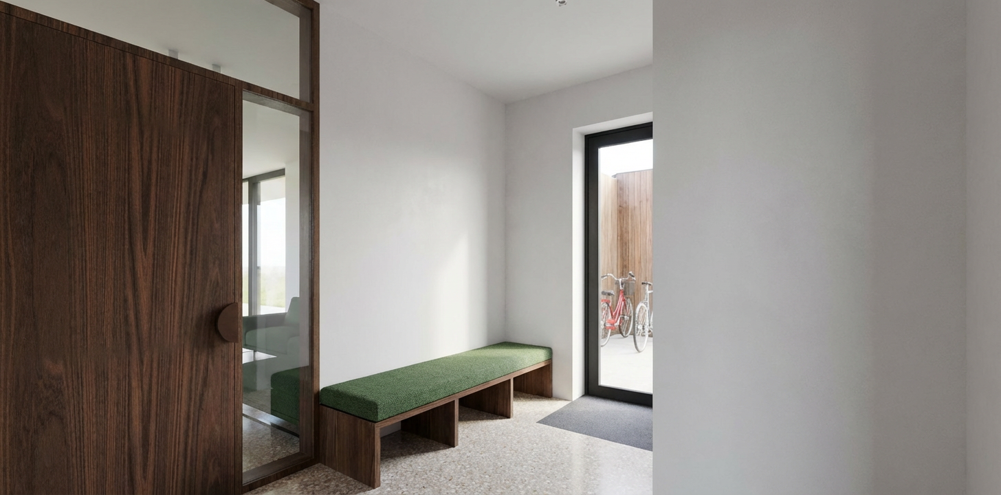 modernist exterior shot replace the current plain background with a warm cozy modern living room interior keep the display cabinet exactly the same do not change its design size color wood grain glass doors black metal frame legs angle or perspective the cabinet must remain in the exact same position on the left side of the image create a soft cozy interior background while leaving the right side mostly empty wall space to keep the composition minimal and spacious background details use a warm cream wall behind the cabinet the display cabinet stays on the left side of the image the right side remains mostly empty wall space to create balance and visual breathing room a tall indoor plant such as a fiddle leaf fig in a neutral ceramic pot placed near the cabinet put a vase with a fresh rose on the display cabinet add light oak wood flooring include soft natural daylight from the right side casting gentle warm light onto the cabinet to enhance the wood texture subtle cozy elements can be added near the cabinet only such as a small neutral rug or a faint wall shadow but keep the right side uncluttered architecture