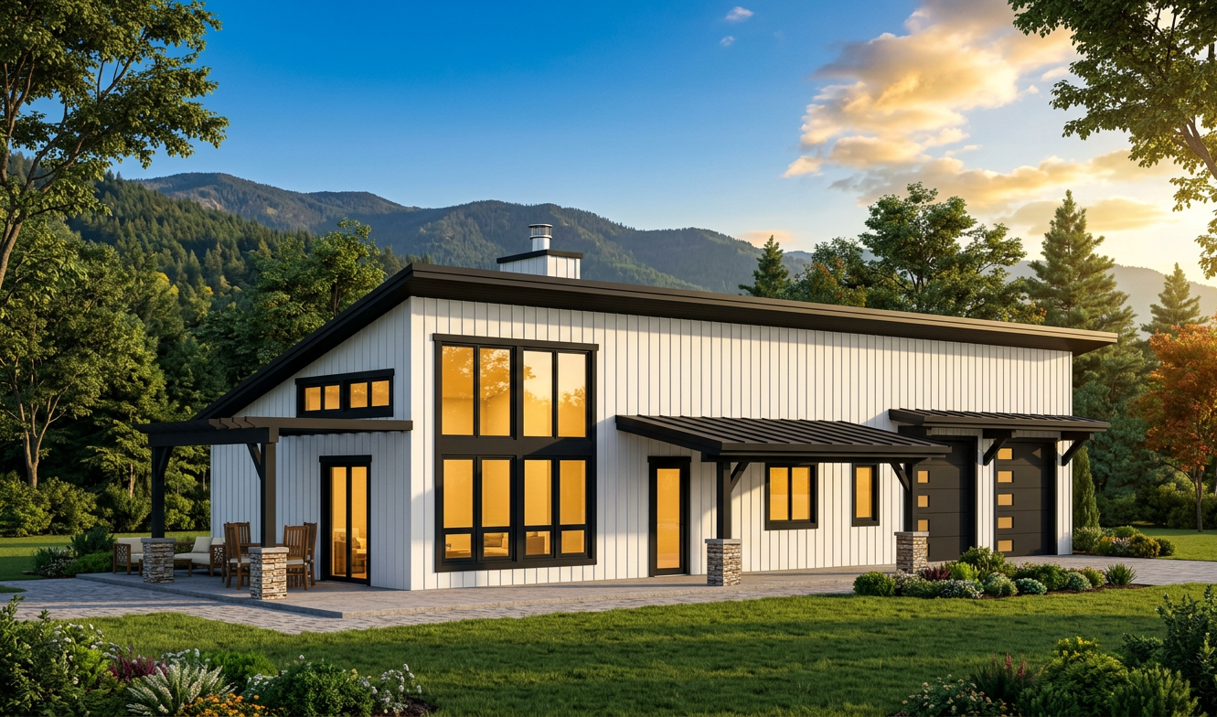 watercolour rendering no changes to architecture in image provided white siding for exterior roof are black add some subtle landscaping local to qc forest in background railing in model is black iron rods do not add in any additional railings not already in the model do not add any pathways this is the rear side of the house show grassy yard make windows and glass doors opaque so we don t see inside of house make it so they are not see through