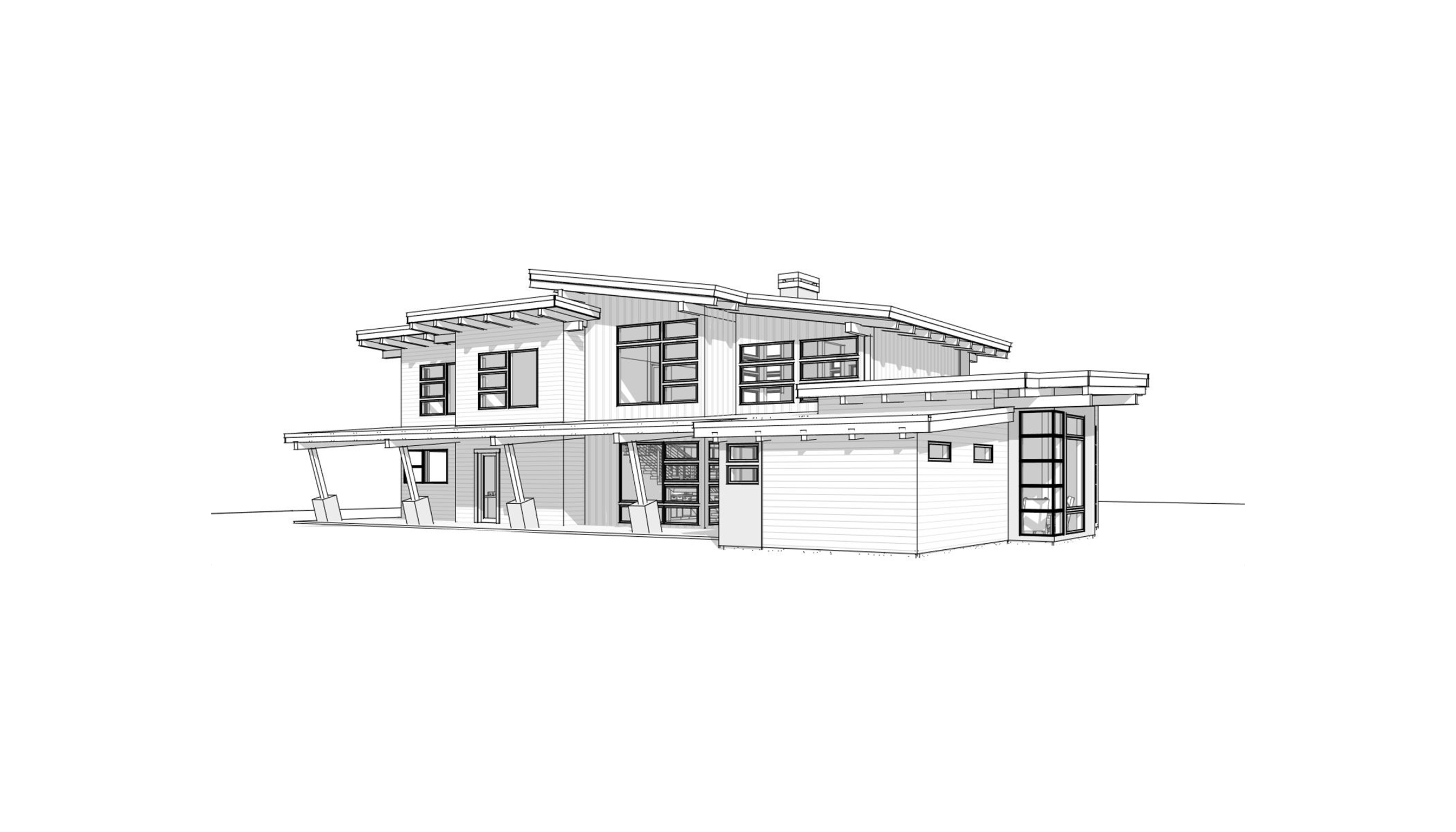 back view of a clean modern architectural exterior rendered in cinematic vibrant golden hour lighting with blue skies mountain modern with heavy timber architectural style streaks of light coming through the trees onto the house wood siding beautifully lush green manicured landscape around structure with hedges and gardens and green grass black standing seam metal roof prominent cinematic oregon valley in the far distance with big douglas fir trees surrounding the house in the background with this house above the valley high fidelity photorealistic visualization crisp shadow falloff refined facade geometry soft atmospheric depth premium architectural photography mood ultra clean composition and materials dark trim around windows