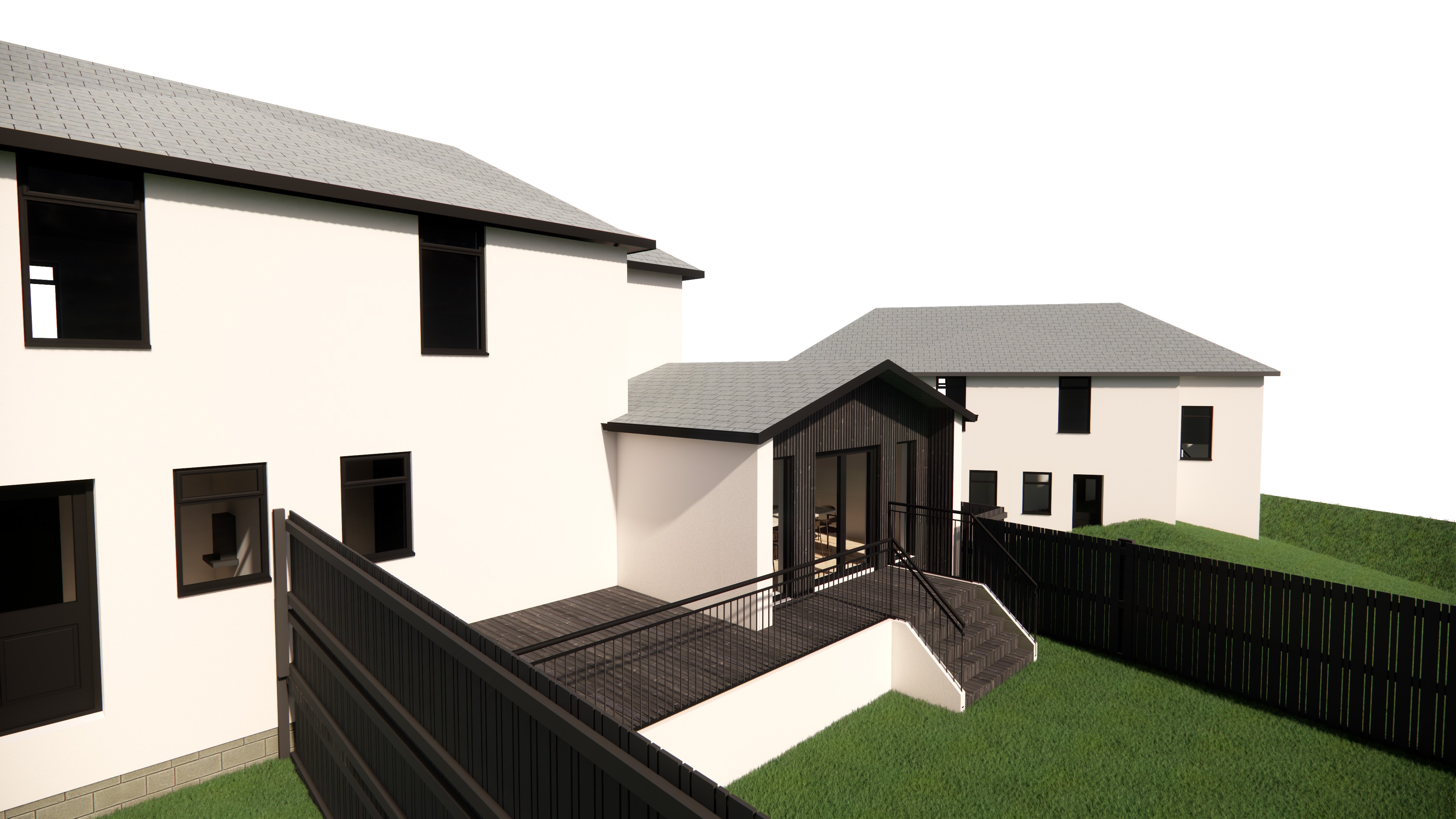 make this render realistic add sky and trees to background white external walls sound be a very ligth cream render with the timber feature walls being black timber battens with deep recess joints