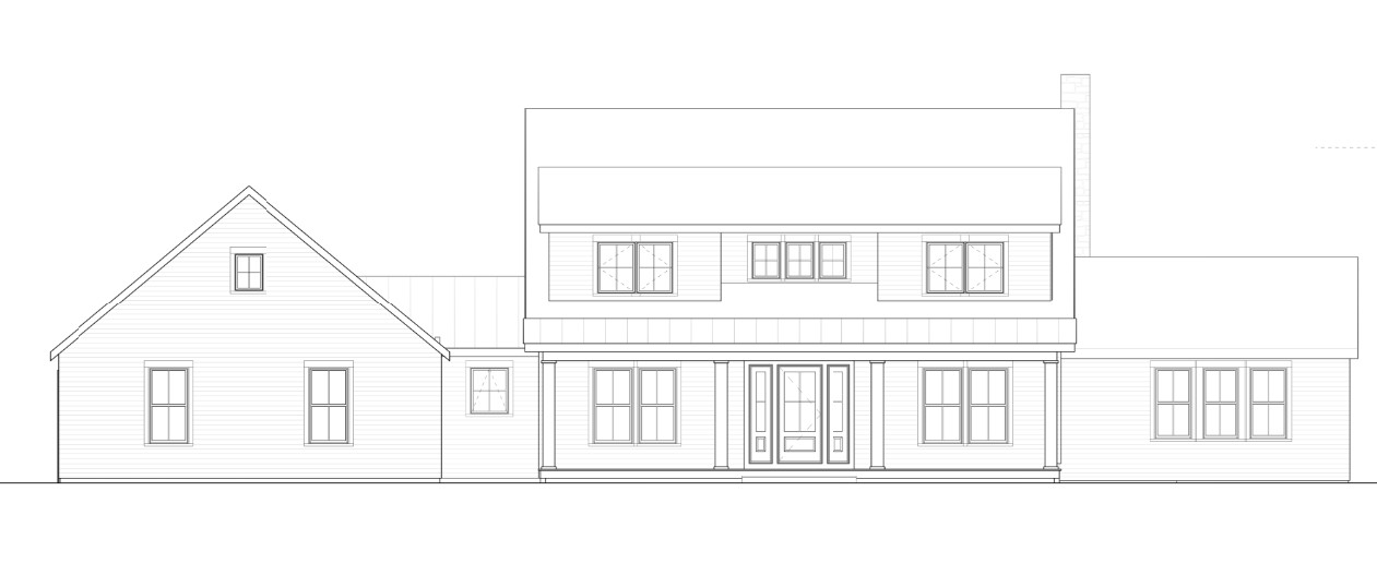 traditional farmhouse with dark gray metal roof at porch only dark gray shingle roof everywhere else white windows white siding decorative white columns wood door main roof has shingles stone veneer chimney front has dormer on second floor