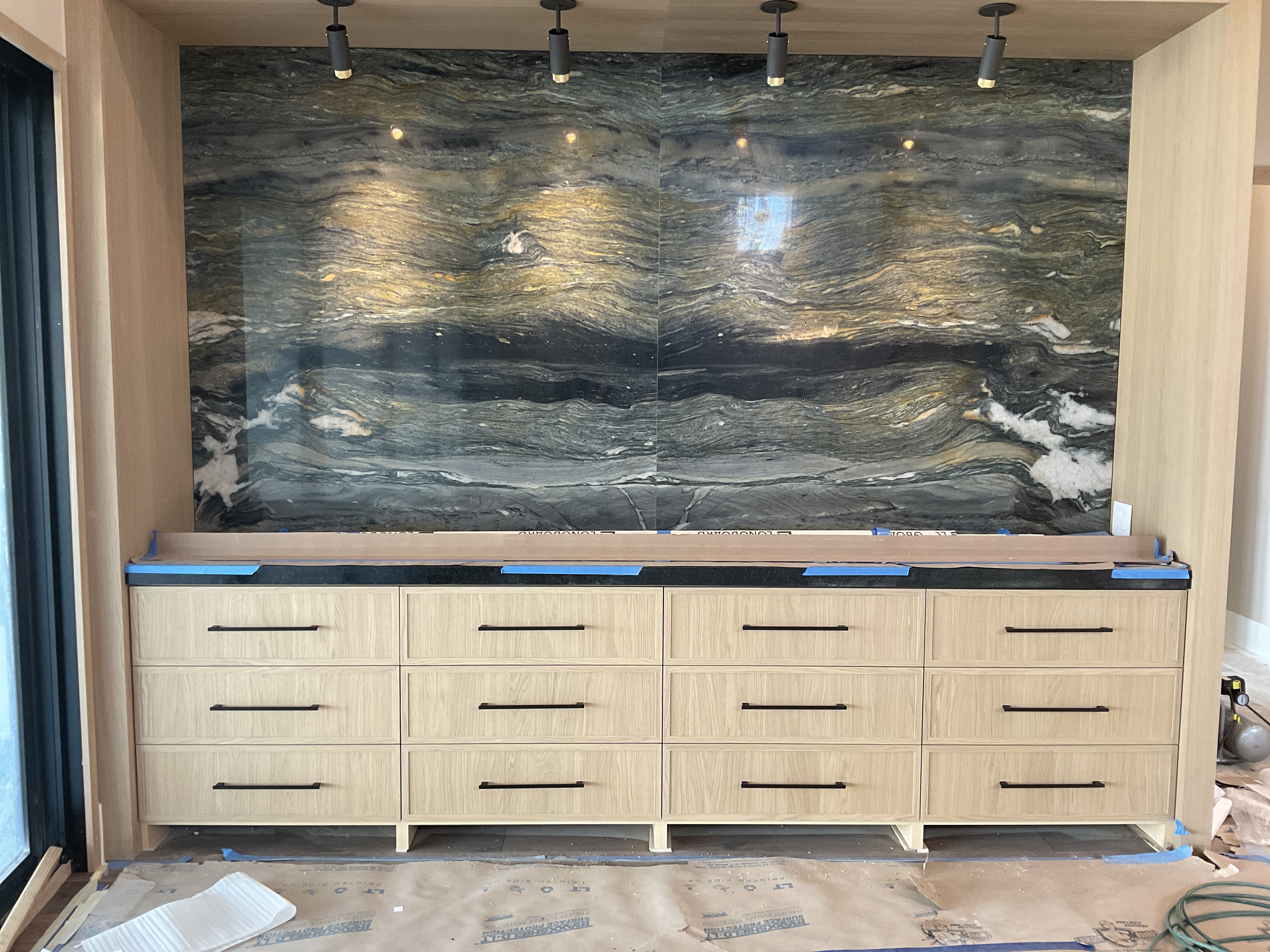 do not change the cabinets in any way preserve the exact cabinet colors materials finishes dimensions door and drawer styles hardware spacing alignment and all geometry exactly as shown do not alter the countertop shape backsplash appliances flooring lighting fixtures or wall structure only remove the construction materials clutter and mess from the scene clean the room and make it look finished and staged add a few simple tasteful home accessories appropriate for the style of the space but do not add or remove any furniture windows or architectural elements maintain the original lighting direction and realism enhance clarity and polish the photo while keeping the cabinetry and room design completely unchanged do not alter the lighting to keep the cabinet colors as they are in the image add toe kick to the cabinets add a piece of artwork that complements the space on the wall that the lights are pointing to