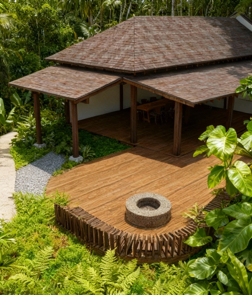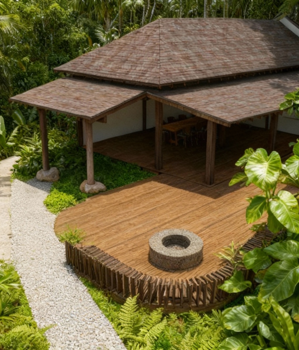 add a gravel pathway only in the place of the blue marking all the way to the inside of the building edge the stone boulder footing of the 2 columns are more organic shaped all the other landscape and decking stays the same