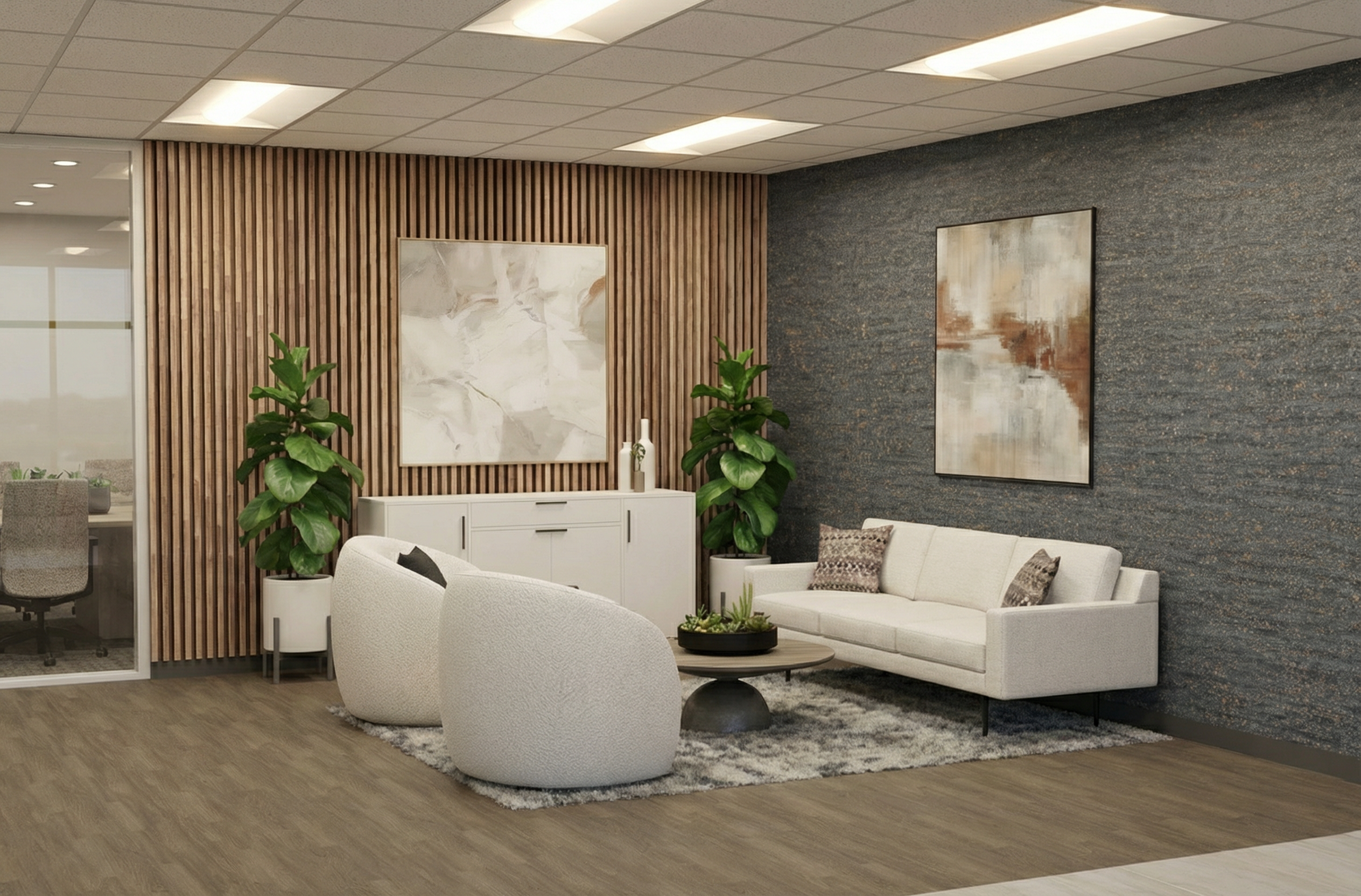 photorealistic architectural interior render absolutely do not change the camera angle perspective room proportions wall angles ceiling height amber terracotta ceiling white plaster walls or polished concrete floor from the reference image provided render from the exact same viewpoint as the reference a row of 4 curved sculpted spa loungers placed along the back wall each lounger is a smooth wave shaped reclined daybed in warm sandy travertine mosaic tile contoured to the body with a raised headrest and footrest each lounger sits on a low plinth base with warm led underlighting glowing softly beneath between each lounger a floor to ceiling frosted glass panel acts as a private divider catching the warm light softly the entire back wall behind the loungers is a continuous water wall a thin sheet of water flowing silently and uniformly down the full height and width of the wall from a hidden channel at the top to a shallow recessed channel at the floor the water catches and refracts the warm ambient light creating a living shimmer across the wall surface the wall behind the water is clad in dark slate or basalt stone making the flowing water visible and luminous against the dark surface track lighting on ceiling rails with adjustable black spots throwing warm focused beams downward warm amber ceiling glow polished concrete floor reflecting the light and the shimmer of the water wall softly only 2 people reclining on the loungers in white spa robes completely relaxed no plants no extra furniture photorealistic render 8k 35mm lens warm golden intimate spa atmosphere