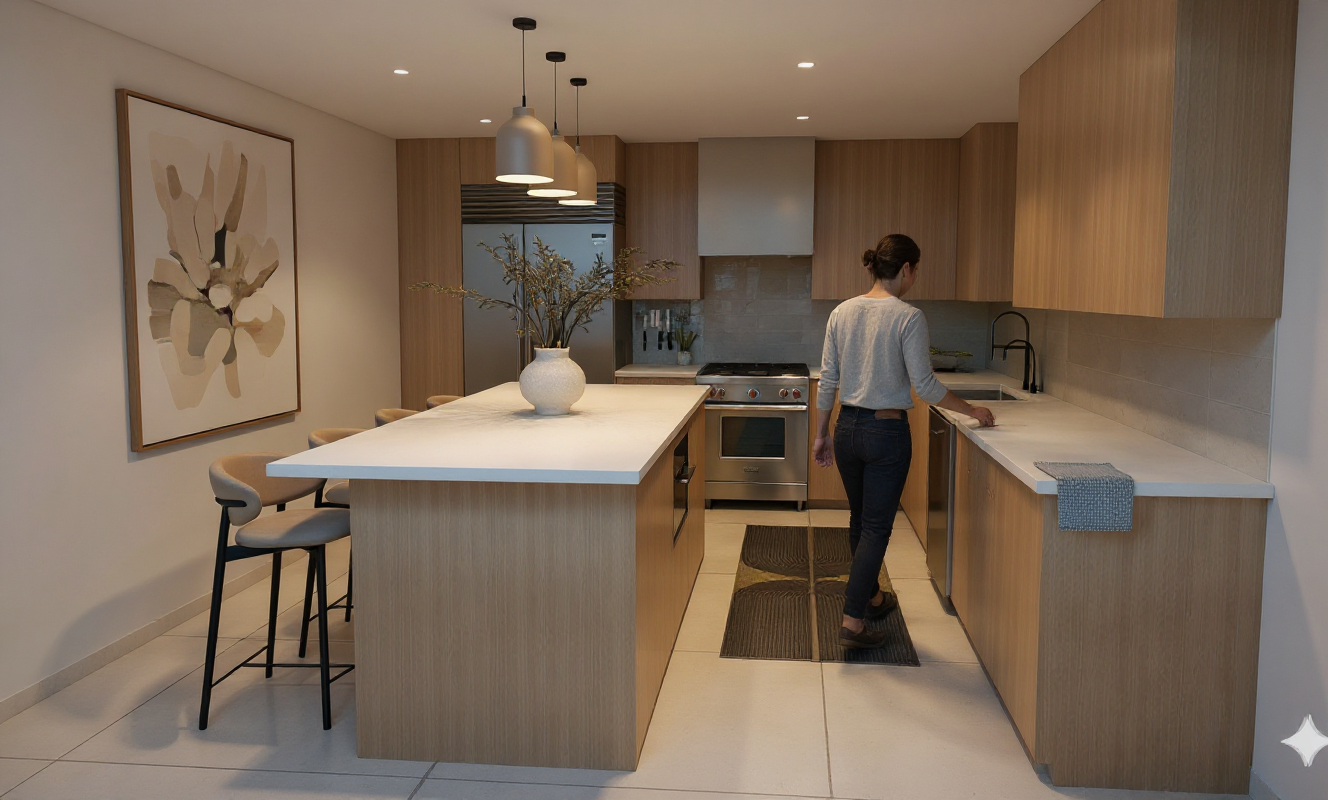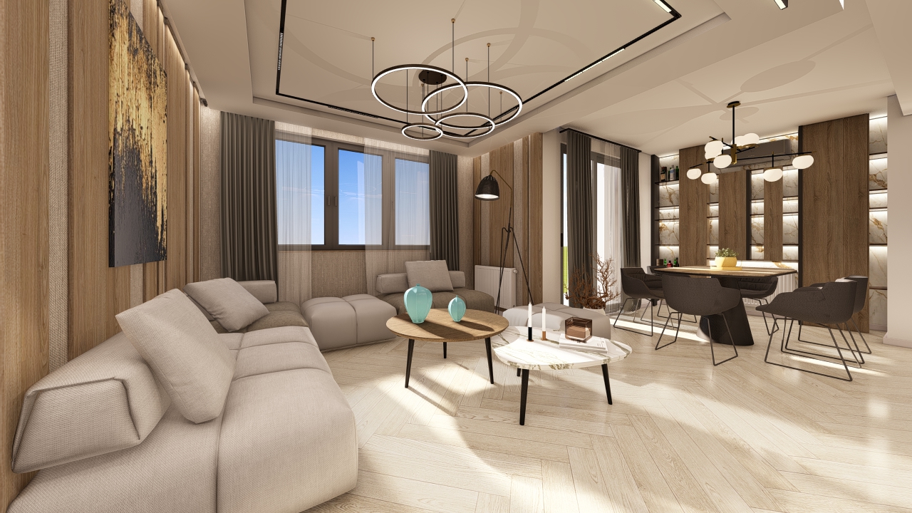 bright day rendering led lightening plants decorations original realistic materials wood heringbone floor