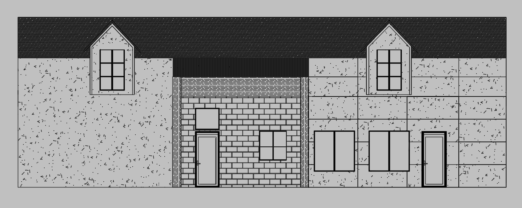 remove dimensions create doormers on wall the second floor the ceiling starts at 6 and the top of the roof is 11 add a dark gray stucco on both sides on the right sidt the stucco is etched the center behind the pillars front porch is a white cream stone with texture with a wooded area all around