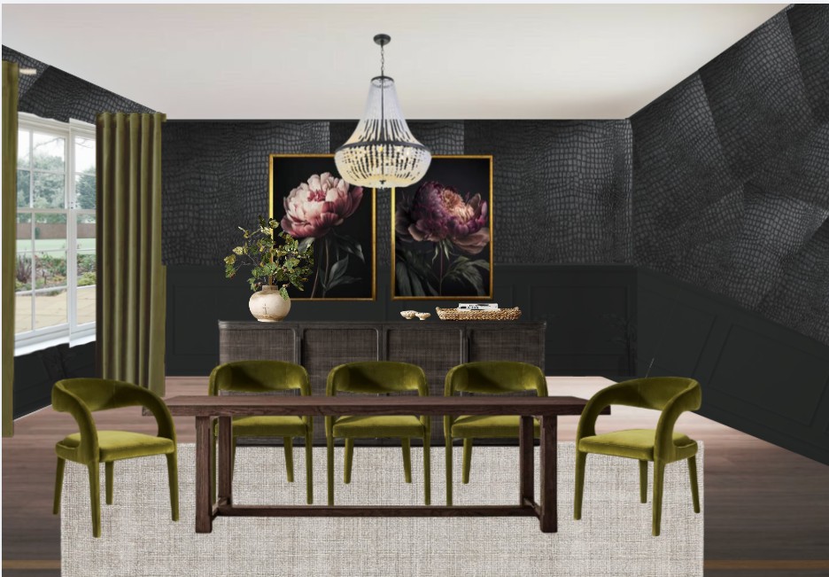 render this dining room in 3d with the following changes make the window on the left a bay window add geometric trimwork to the ceiling
