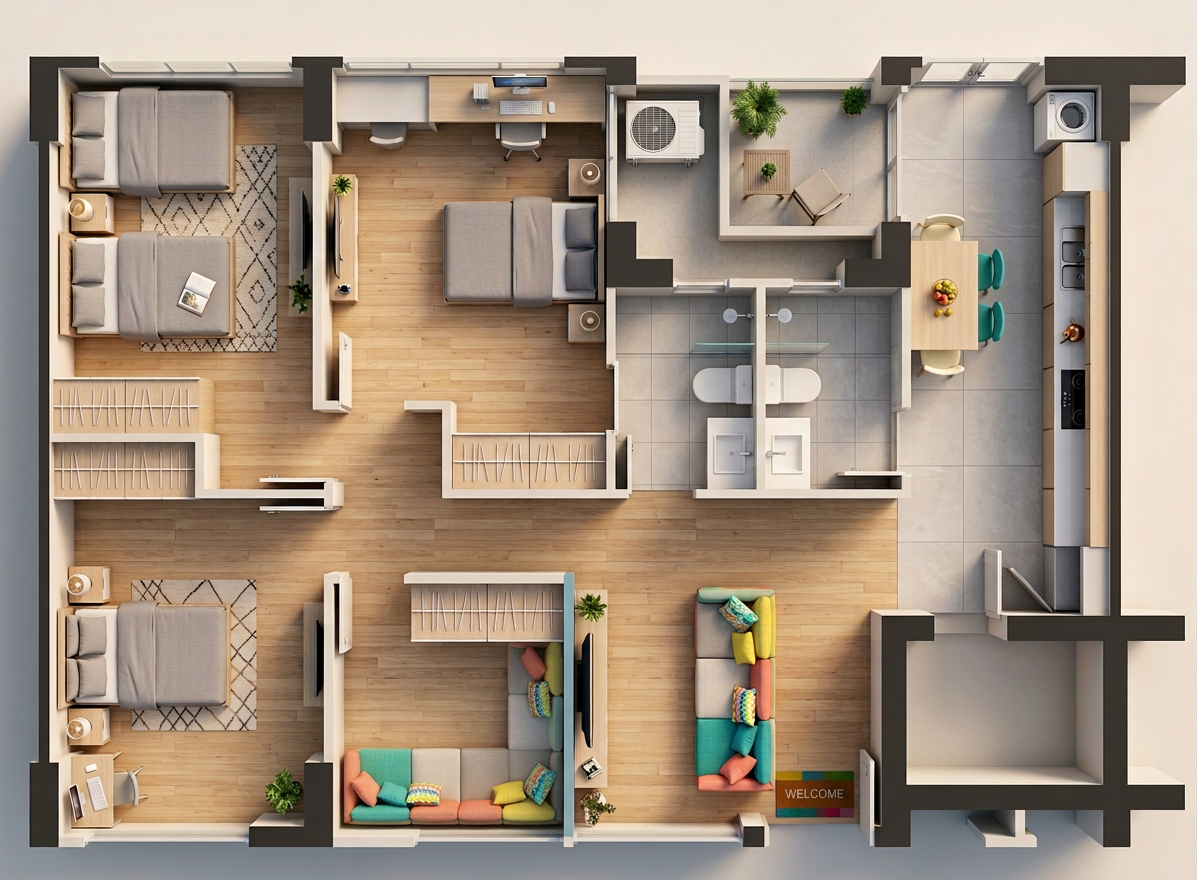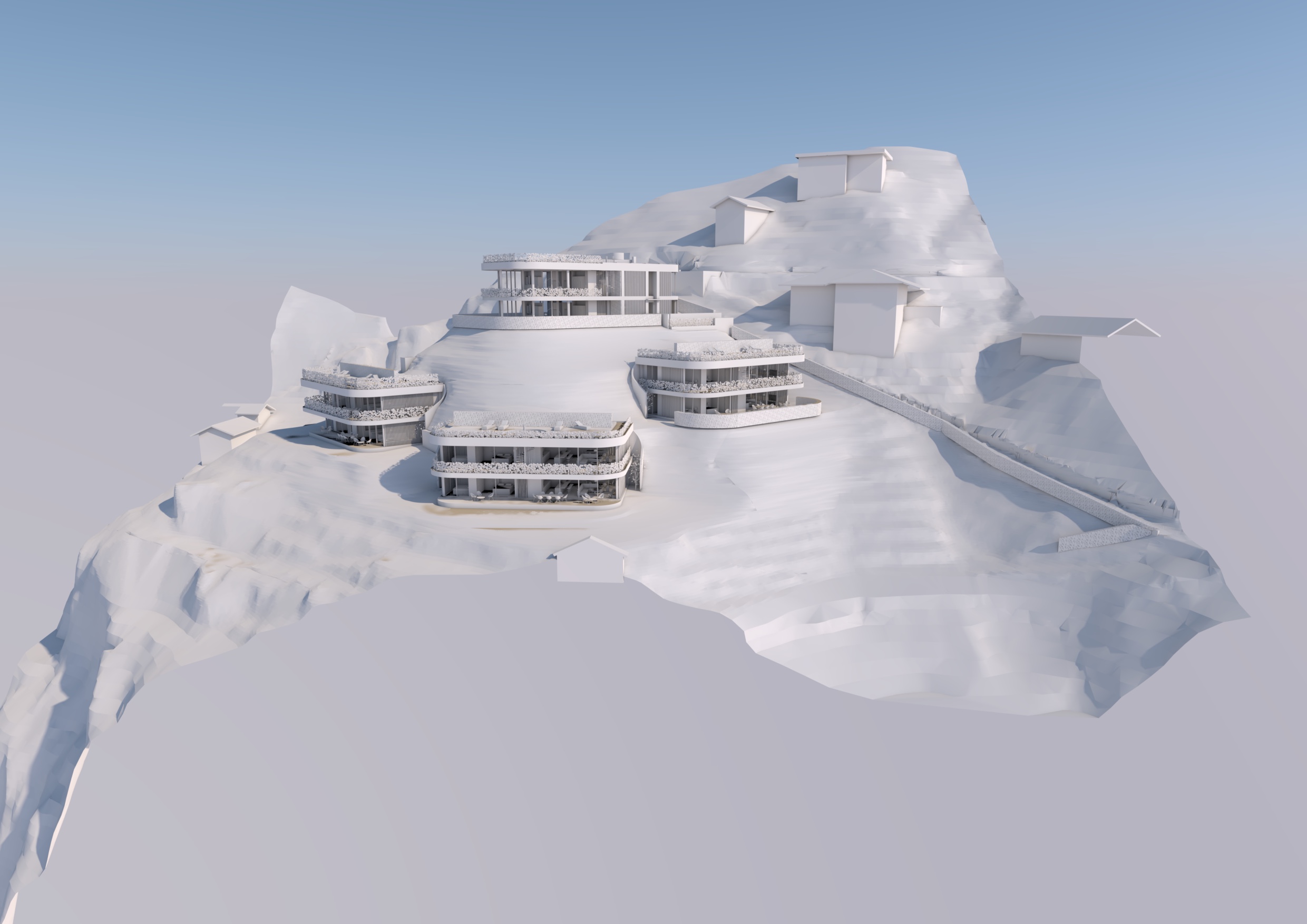 concrete facade with black aluminium windows and plants in vase around the terraces feel free to add vegetation through the gardens between the buildings as if it was a private park of the residential complex