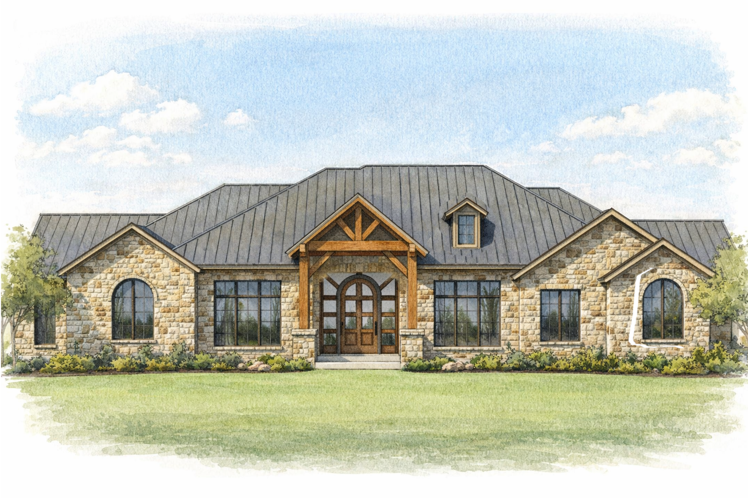 please keep this illustrated style respect the geometry but improve on the materials also can exposed rafter tails be added at the overhangs to the left and right of the front porch