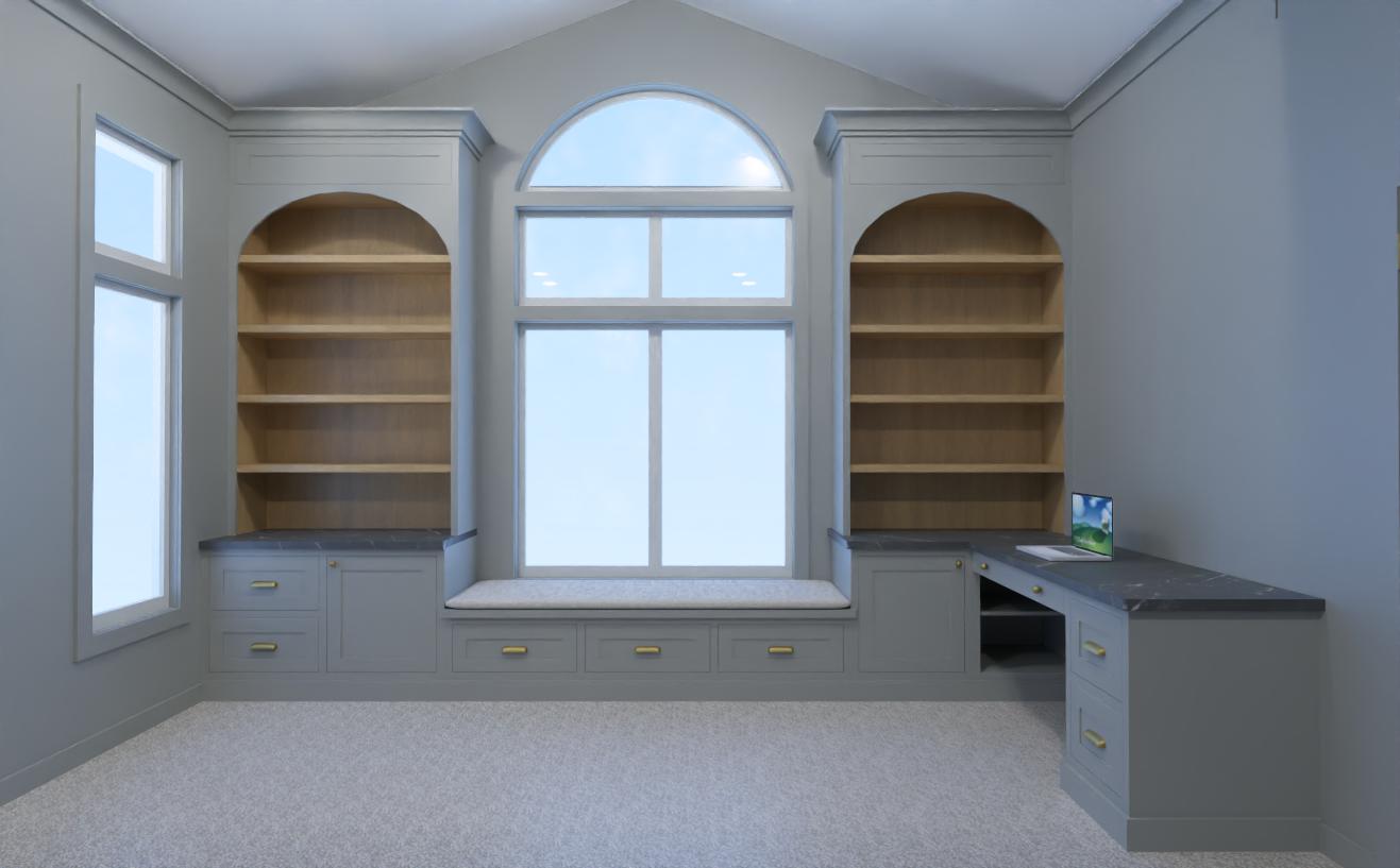 render a luxuriously elegant room corner featuring a built in bookshelf make the bookshelf wood grain a rich warm oak design the frame and cabinets in a sophisticated warm gray with gold knobs for an opulent finish the walls should match the warm gray cabinets offering a calming and neutral backdrop incorporate a soft plush carpet in a creamy light greige to add warmth through the window allow a evening sunset sky to enhance the serene atmosphere aim for a modern minimalist style with a touch of classic elegance