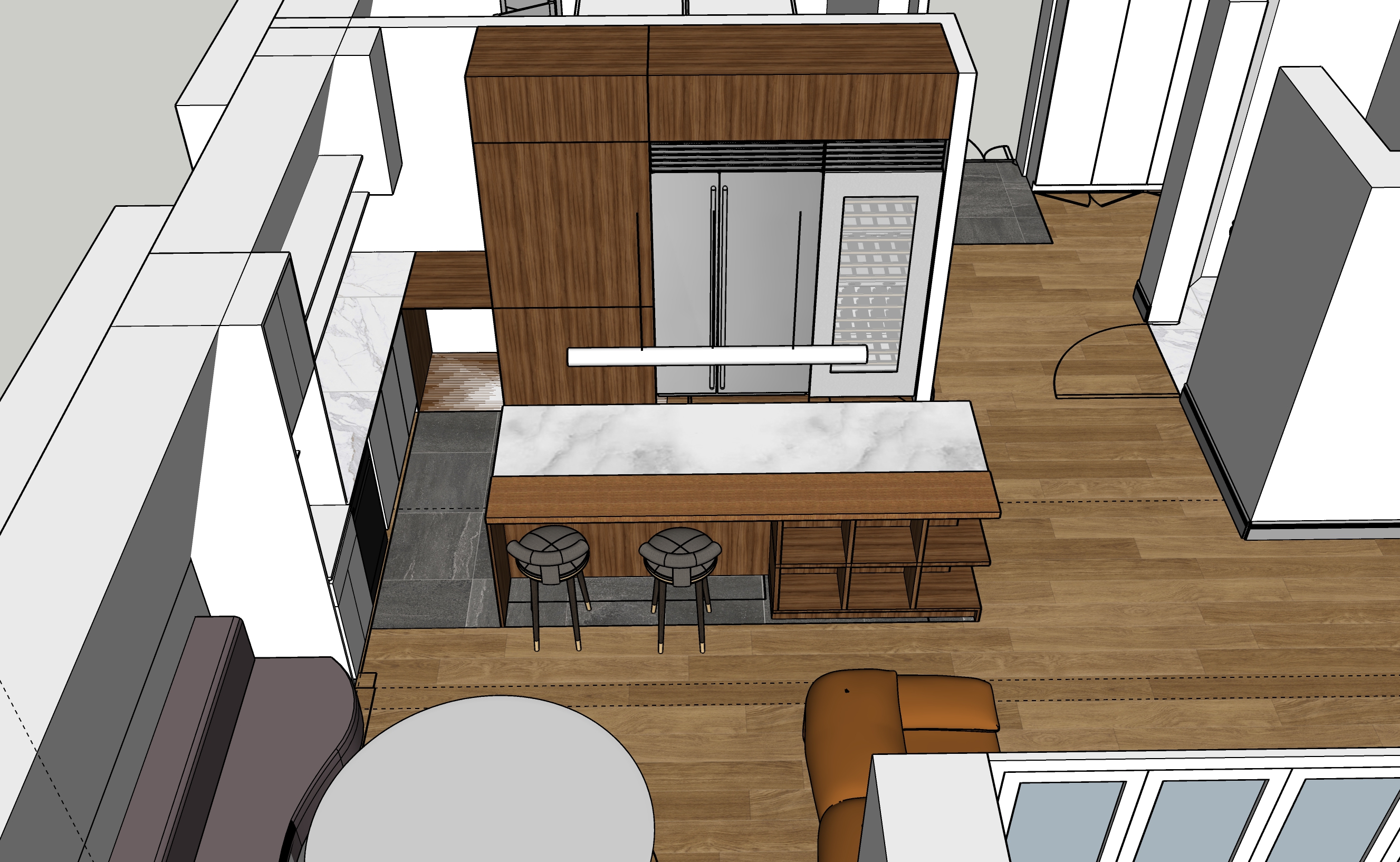warm white kitchen with a oak kitchen cabinet doors with marble countertops on a sunny day