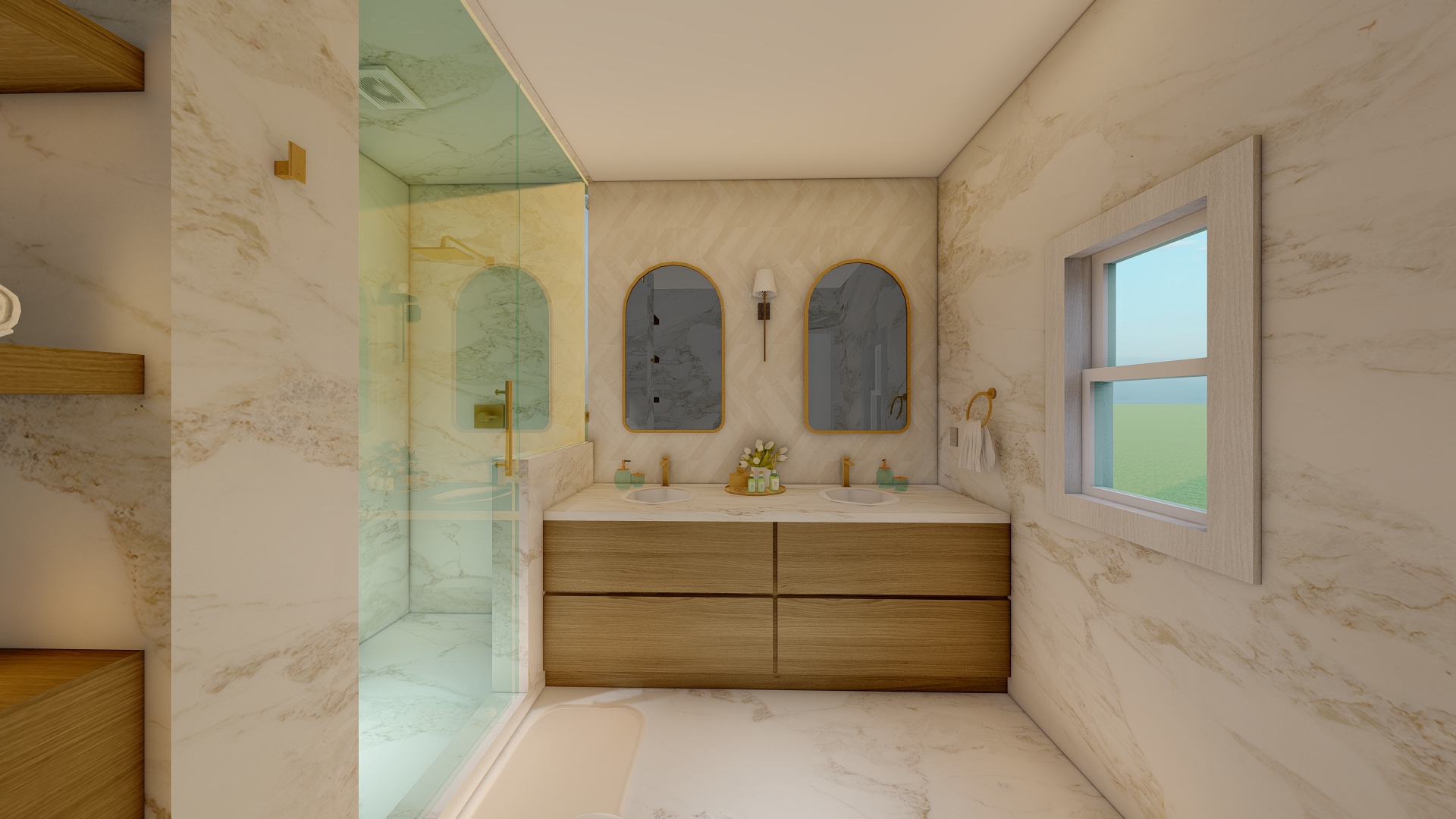 ultra realistic modern bathroom with balanced natural lighting and soft shadows keeping the exact same layout and proportions vanity in medium warm oak wood natural grain beige undertones soft matte finish subtle texture realistic pbr material albedo roughness normal not bleached not too light mirror wall finished exactly as shown herringbone marble tile pattern 3 12 inch tiles soft white cream gray veining subtle natural variation glossy or satin finish tight grout lines high detail displacement seamless pbr texture albedo roughness normal displacement photorealistic lighting response premium interior material all other walls and floor in ceramic marble look tile soft white beige base with subtle grey veining polished finish natural stone variation refined and contemporary inside the shower use the same ceramic marble look tile as the rest of the bathroom not the herringbone gold fixtures with clean reflections accurate material textures crisp details and a warm inviting atmosphere include the wall sconce between the two mirrors with a realistic light emission effect soft glow natural falloff and warm color temperature enhancing the ambiance without overexposure