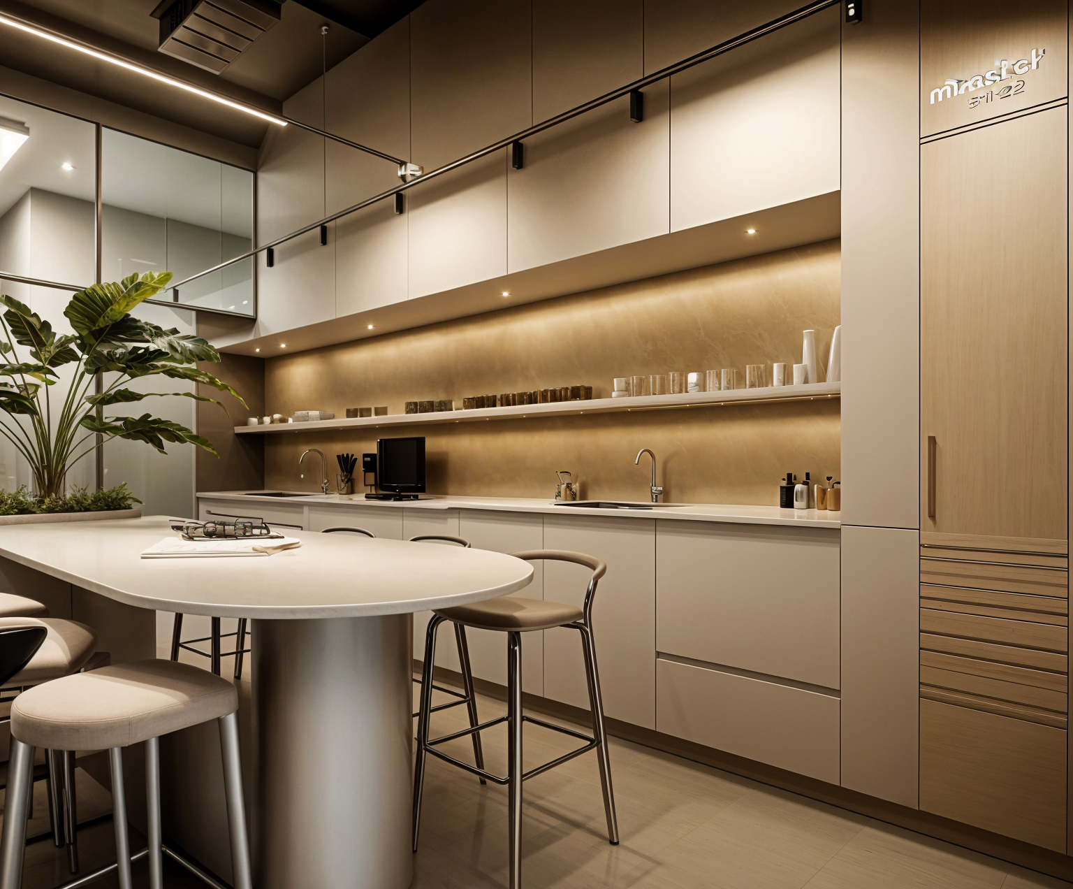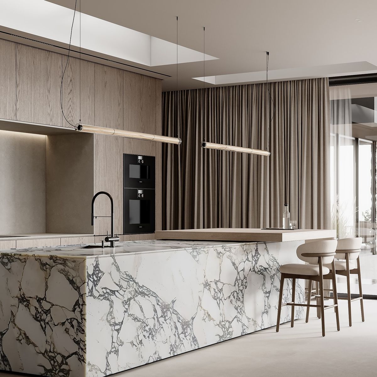 a modern luxurious kitchen with a minimalistic design the centerpiece is a marble kitchen island with intricate white and gray veining the cabinetry is a light wood tone complemented by sleek matte black appliances pendant lighting above the island emits a soft warm glow the atmosphere is serene and sophisticated with floor to ceiling taupe sheer curtains adding a touch of elegance the room is bathed in natural light emphasizing the neutral palette and creating a serene inviting environment the floor is a smooth light beige timber contributing to the calm and upscale ambiance