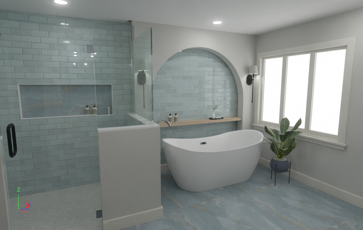 create a serene modern bathroom with a soft calming atmosphere focus on light blue subway tiles for the shower and feature wall complemented by light grey walls include a large curved white freestanding bathtub the floor should have a marble texture in soft shades of grey and blue add a wooden shelf with minimalist decor like a small plant and bottles include a tall green plant in a dark blue pot near the window use soft diffused lighting to enhance the tranquil mood make photorealistic do not change colors as in my original image