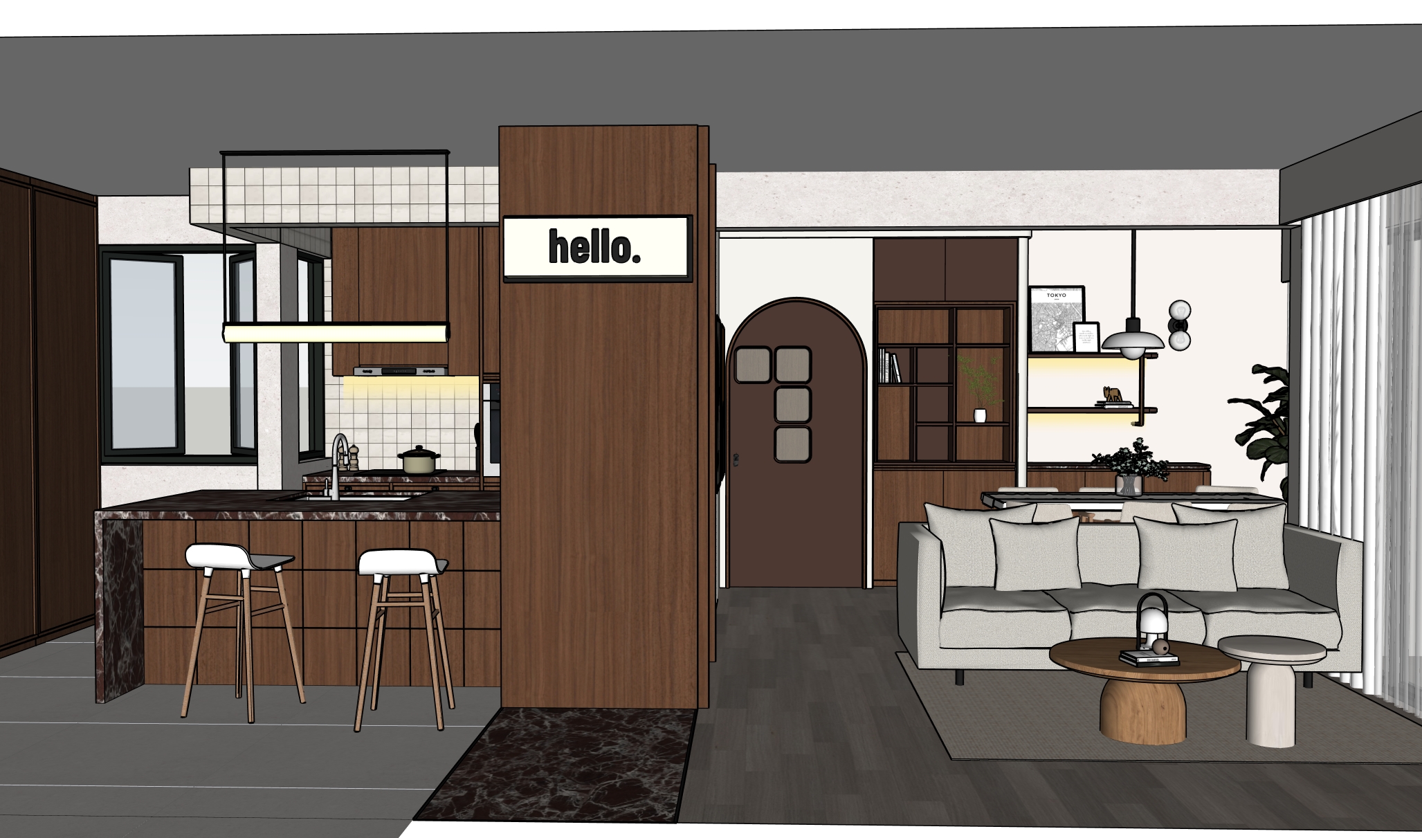 colours and texture to remain accurate as per original picture kitchen in 900 x 900 muted light beige tiles living room in muted light brown vinyl in between kitchen and living in dark maroon marble large tile hello lightbox countertop in dark maroon marble walls in off white subtle texture door in dark maroon purple plain laminate top hung at shelvings in dark maroon purple plain laminate 4 small squares at open shelving backing in dark maroon purple plain laminate other carpentry in dark brown laminate