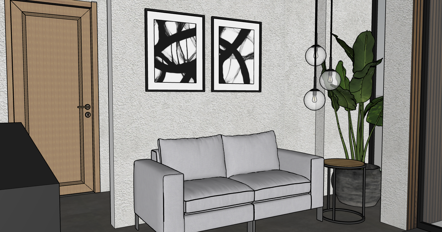 remove light pendant make door on left flat and remove panelling make sofa a light grey textile fabric make outside window a pavement