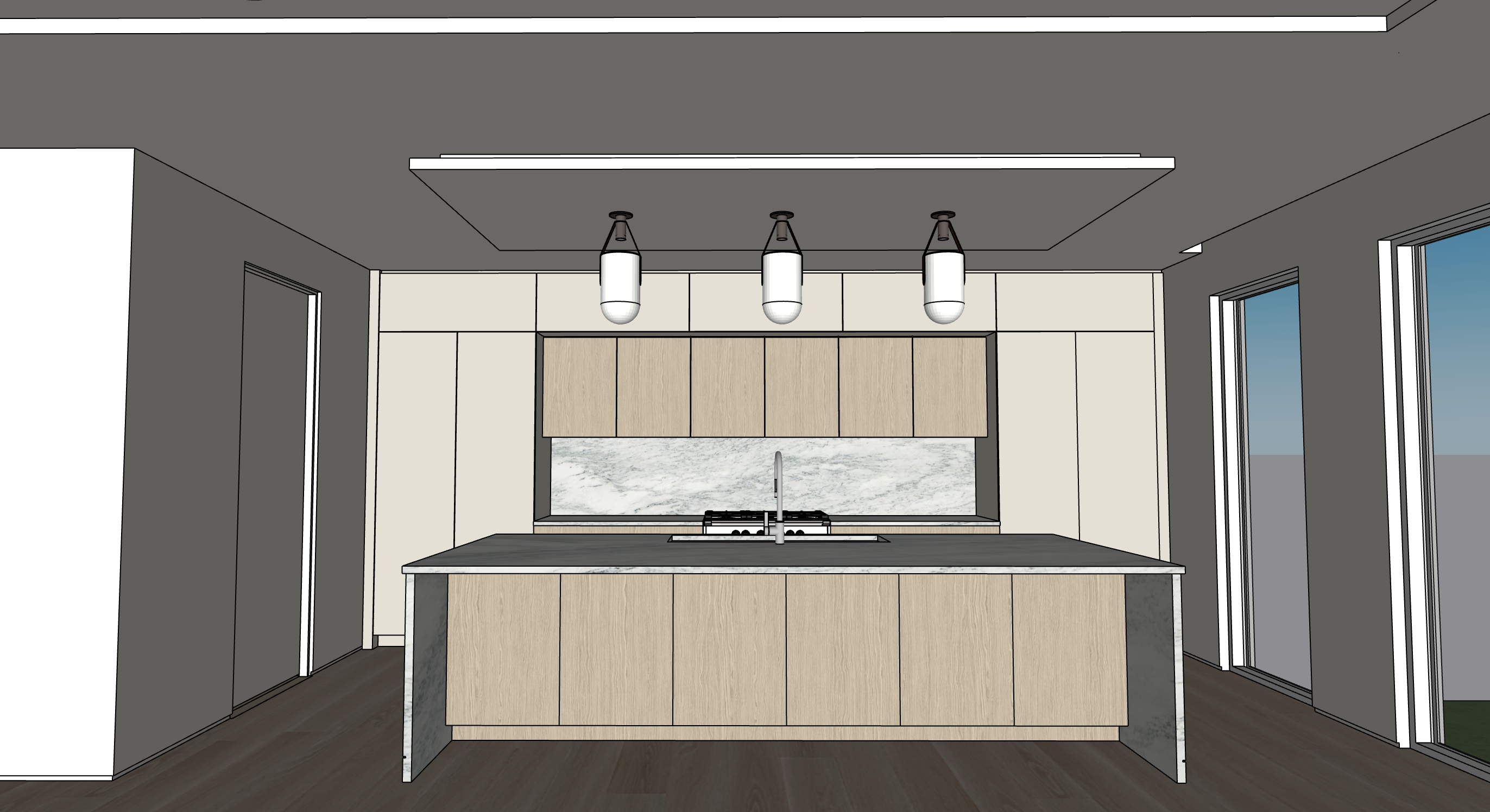 interior shot please render this kitchen to make it photorealistic floors are wide plank white oak walls and ceilings are painted white dove by benjamin moore perimeter cabinetry is painted slipper satin by farrow ball marble countertops and backsplash are danby marble faucet is dornbracht and range is fisher paykel these are these pendants above the island https www alliedmaker com flush well 14 island cabinetry is rift white oak please add counter stools