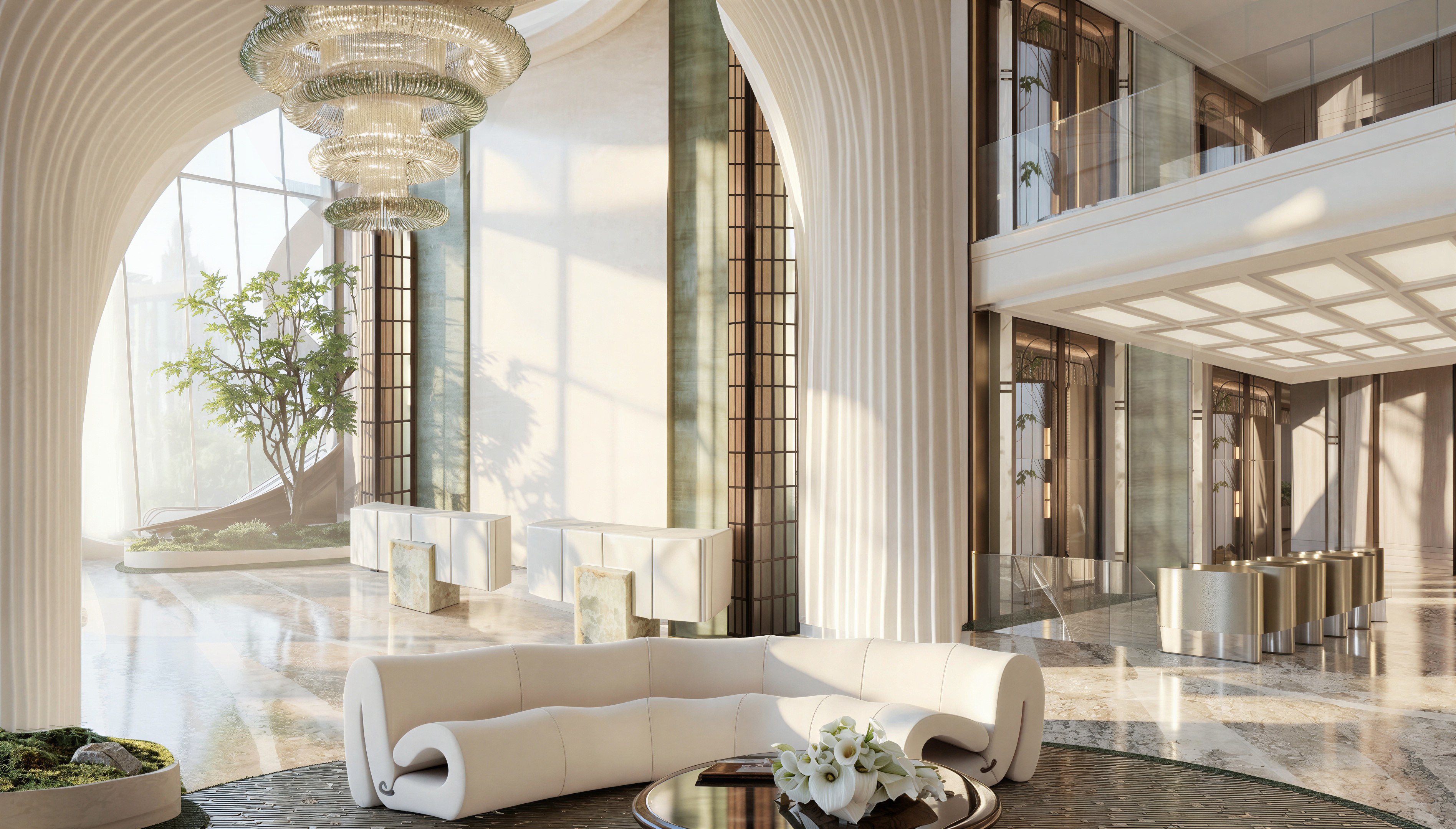 make this more evening shot with decorative lighting from chandelier on put more light glowing on the tree from the bottom can you add glow to under reception desks