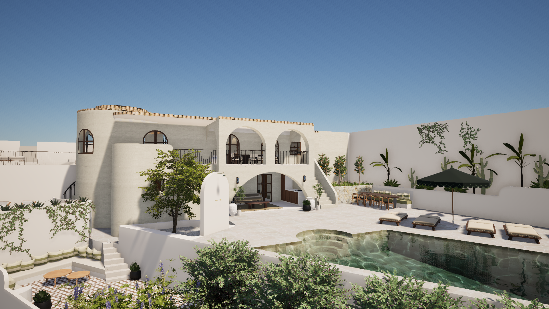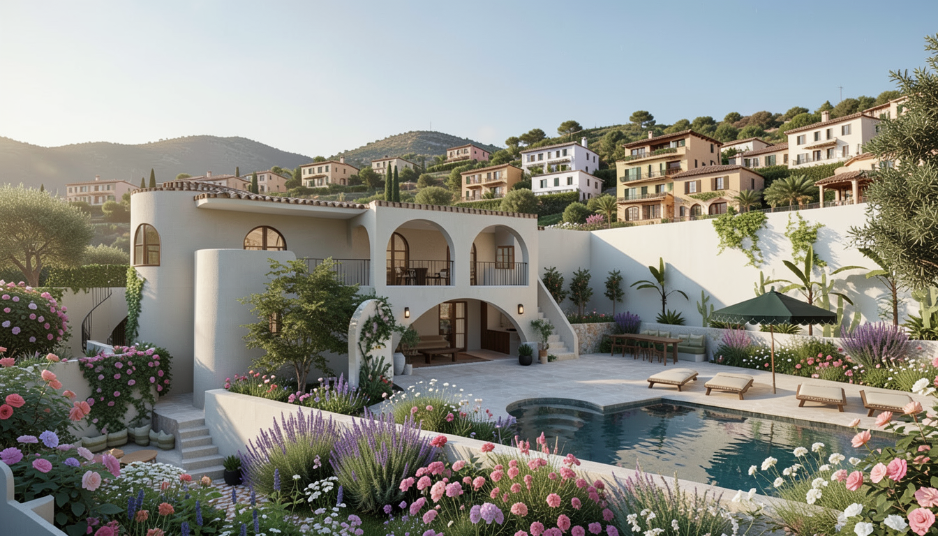 make realistic render from this house in el portet moraira lush garden with lots of green purple pink and white flowers in mediterrenean style surrounded by mediterenean atmosphere and spanish boutique villa s on a hill in the background