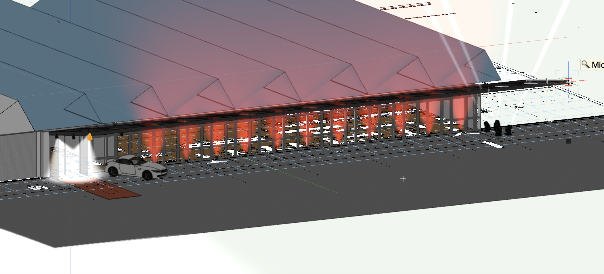 make this a oscar red carpet scene use the red lights in front of the house to give a red shine to the glass wall use same color for the roof make the skybeam lights on the right visible with white beams shining into the night make the car into an aston martin use a red carpet in front of the door and put some people on it use some above lights on the red carpet use only the car in front of the door no other cars in front of the house there is only one street no green no grass the red carpet neds to lead from the door to the street only put the car exactly where it is beside the entrance