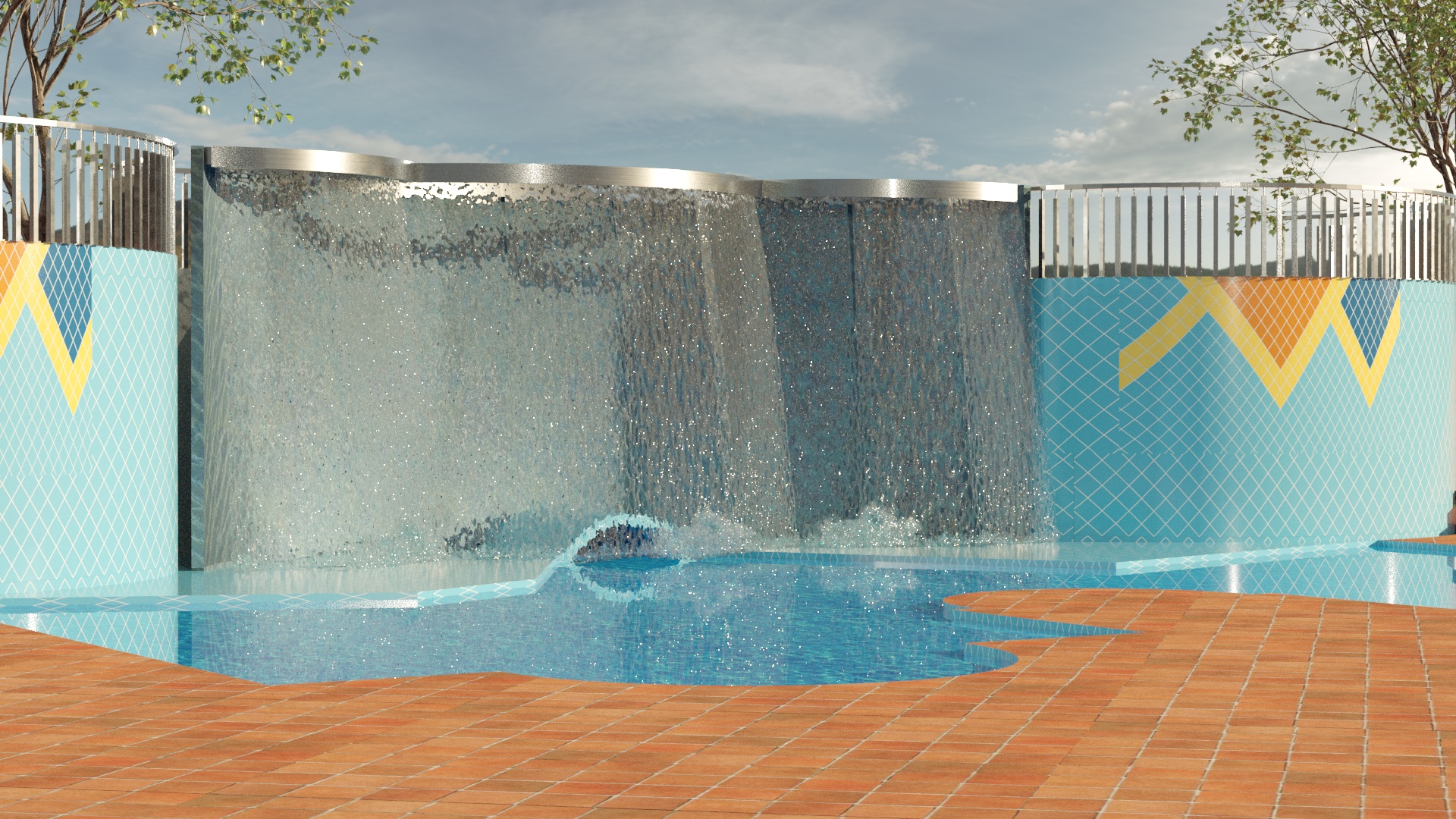a waterwall flowing into the pool with a bright blue wall behind it