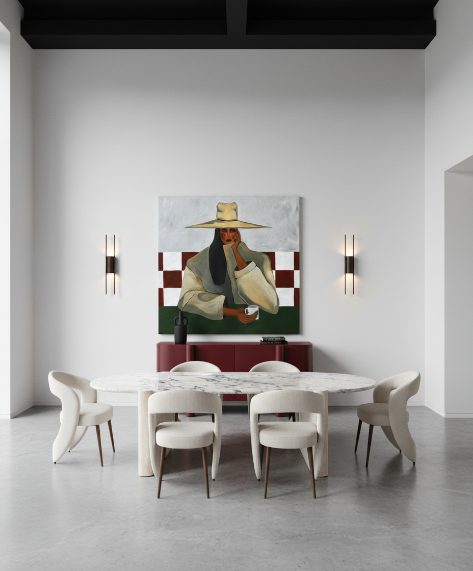 room floor is concrete walls are white ceiling is double height and black the dinning table top is calacatta viola marble the base is travertine put 4 dinning chairs make the buffet wider add 2 wall lighting one in burgandy and the second in black