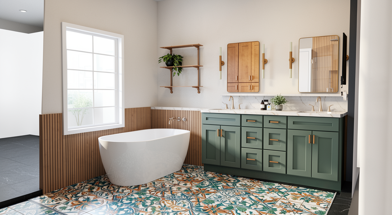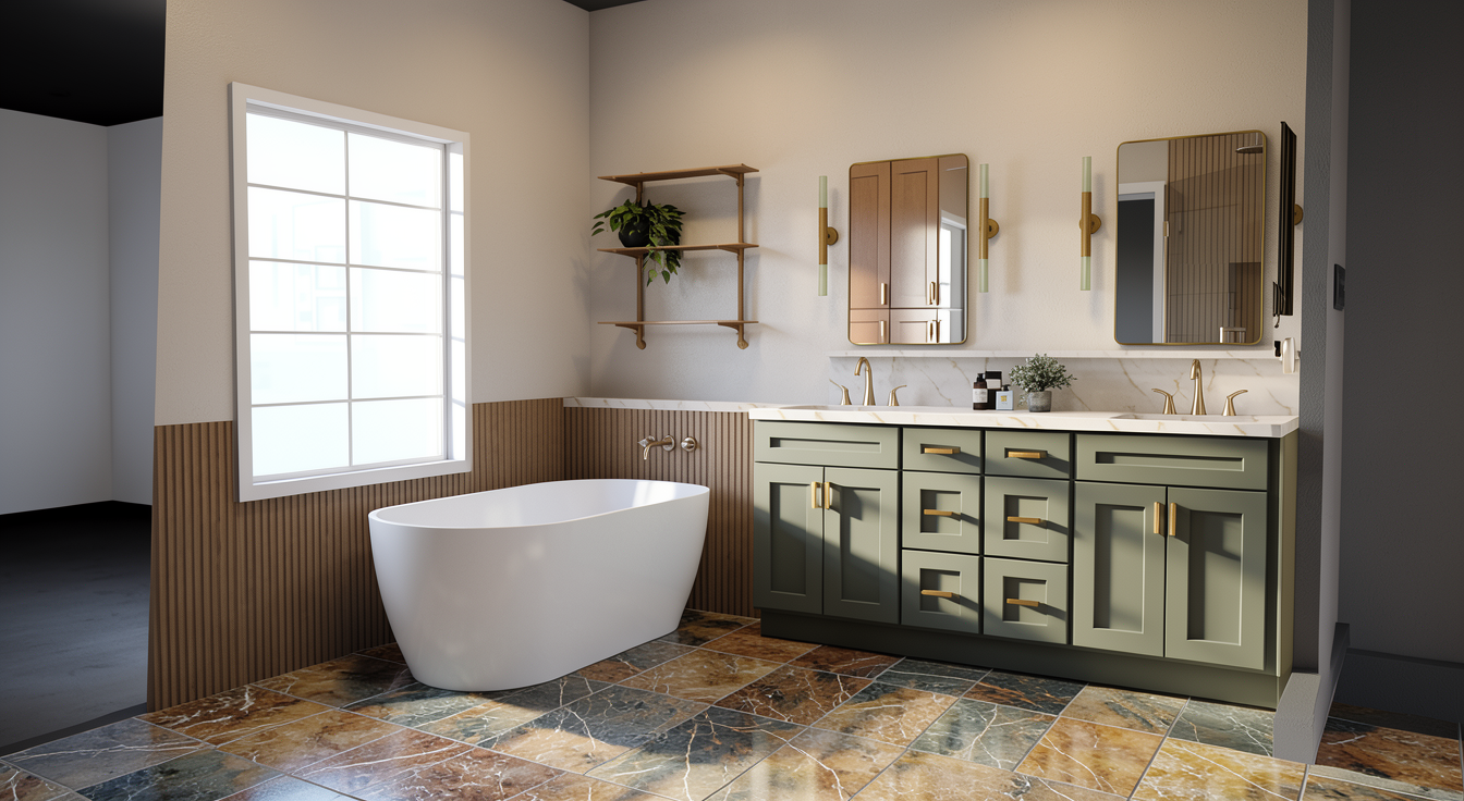 modernist interior shot create a modern minimalist kitchen interior the kitchen features sleek sand sahara beige cabinetry with soft taupe undertones the wall units sleek woden decor large matte black refrigerator and appliances add a contemporary touch incorporate a white marble countertop with subtle gray and slightly golden veining for the island include two plush light gray barstools with thin black legs the flooring is glossy white marble enhancing the luxurious feel let in natural light that casts soft shadows creating a bright and airy atmosphere the background walls are painted in a muted white maintaining a clean and cohesive look add some dining furniture and just a few decorations make it look ultra high realistic architecture