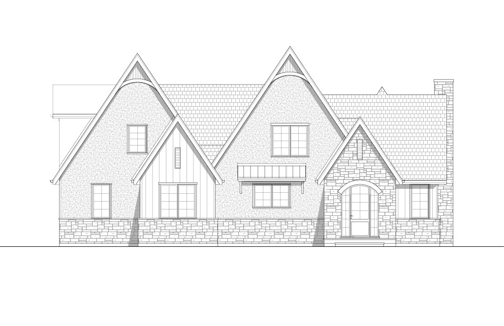 grainy watercolor render of charming cottage building with black wood siding off white stucco stone wainscot watercolor trees and urban environment in the background extensive watercolor landscaping surrounding the building prairie landscaping in the background cozy atmosphere isolated building no homes in the background