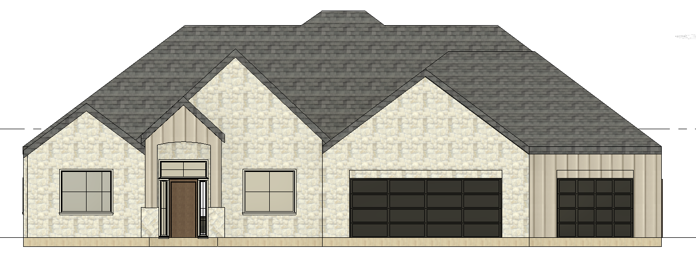 photorealistic front exterior render of the same home shown in the sketch keep the structure exactly as drawn do not replace or move windows or garage doors all window frames and grids should be a warm cream color not black use realistic lighting matching the tone and material quality of the original reference stone light limestone siding soft taupe vertical board and batten roof dark gray shingles neutral landscape with natural shrubs and grasses in greens and tans maintain accurate proportions and architectural features