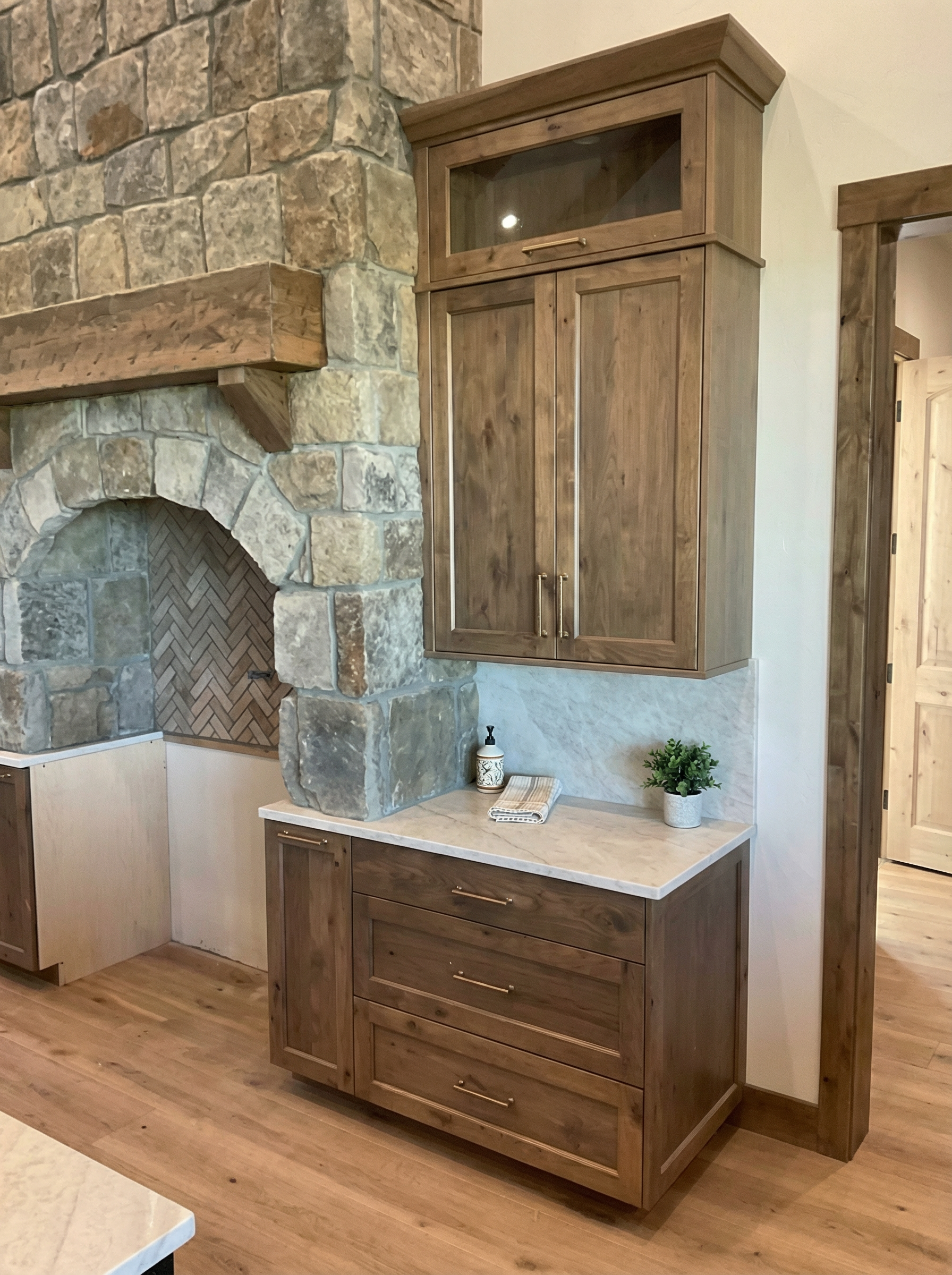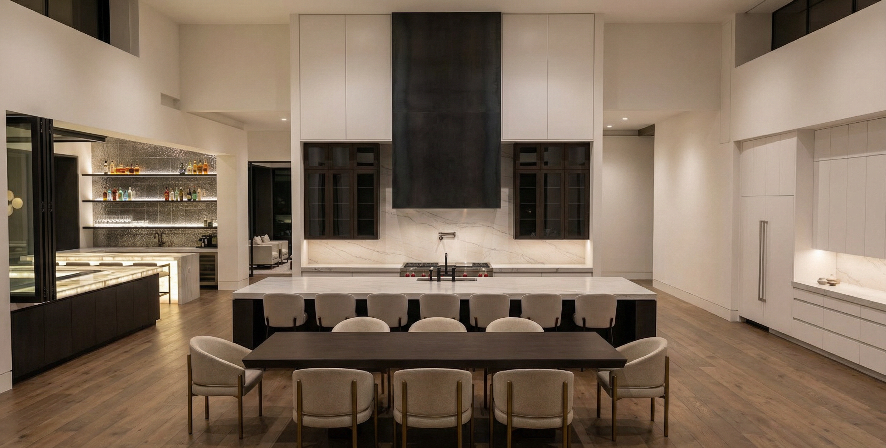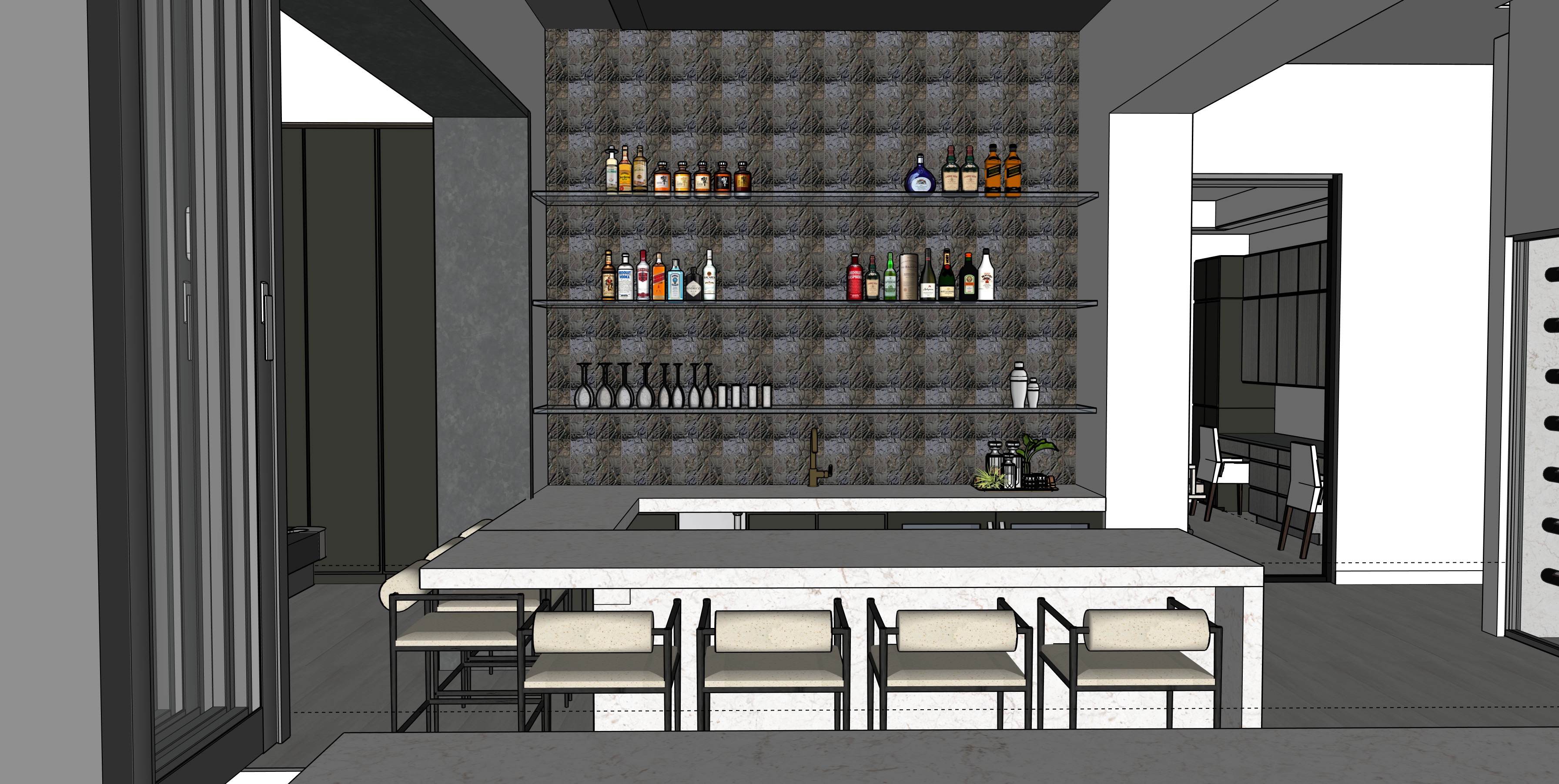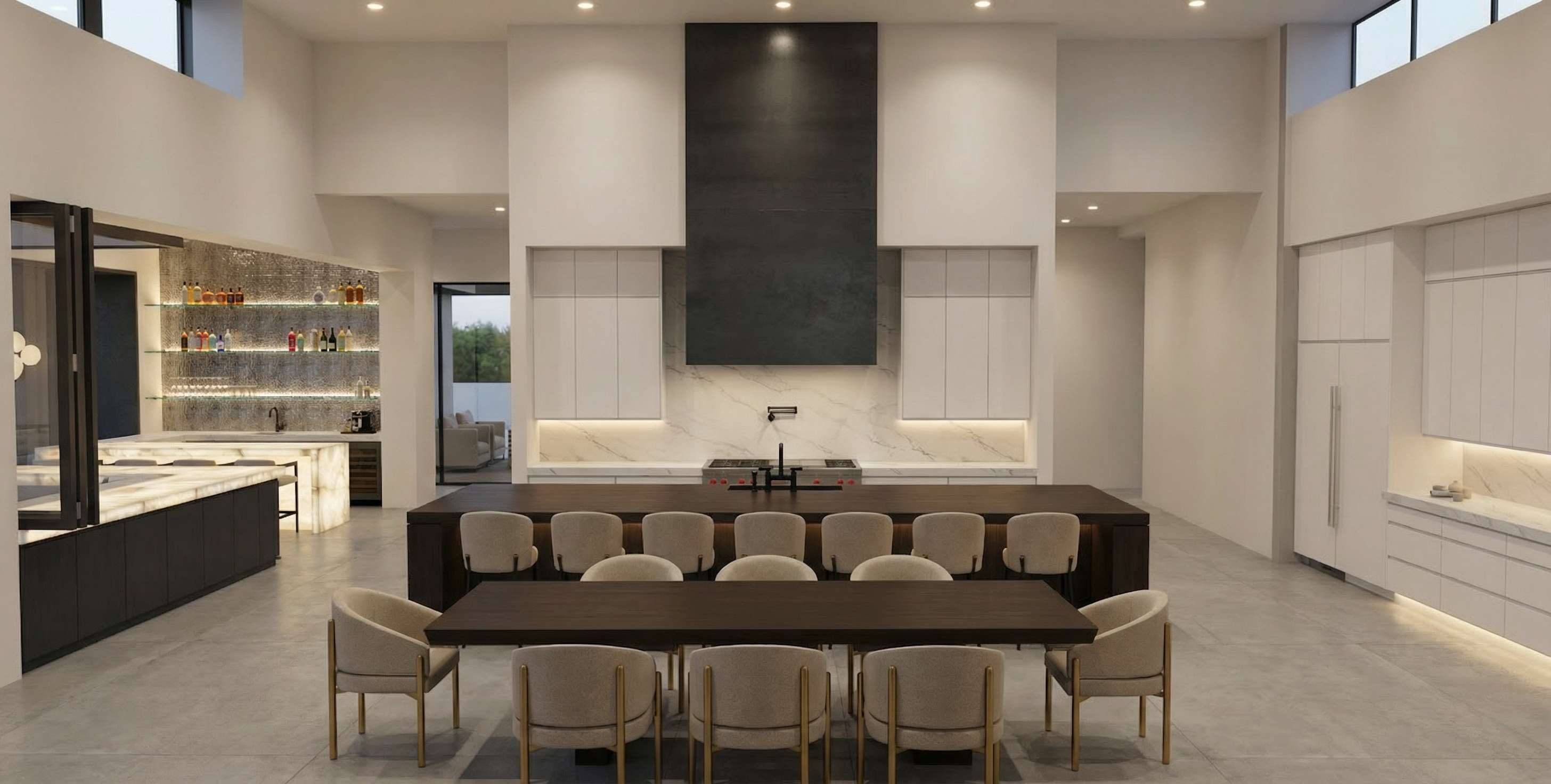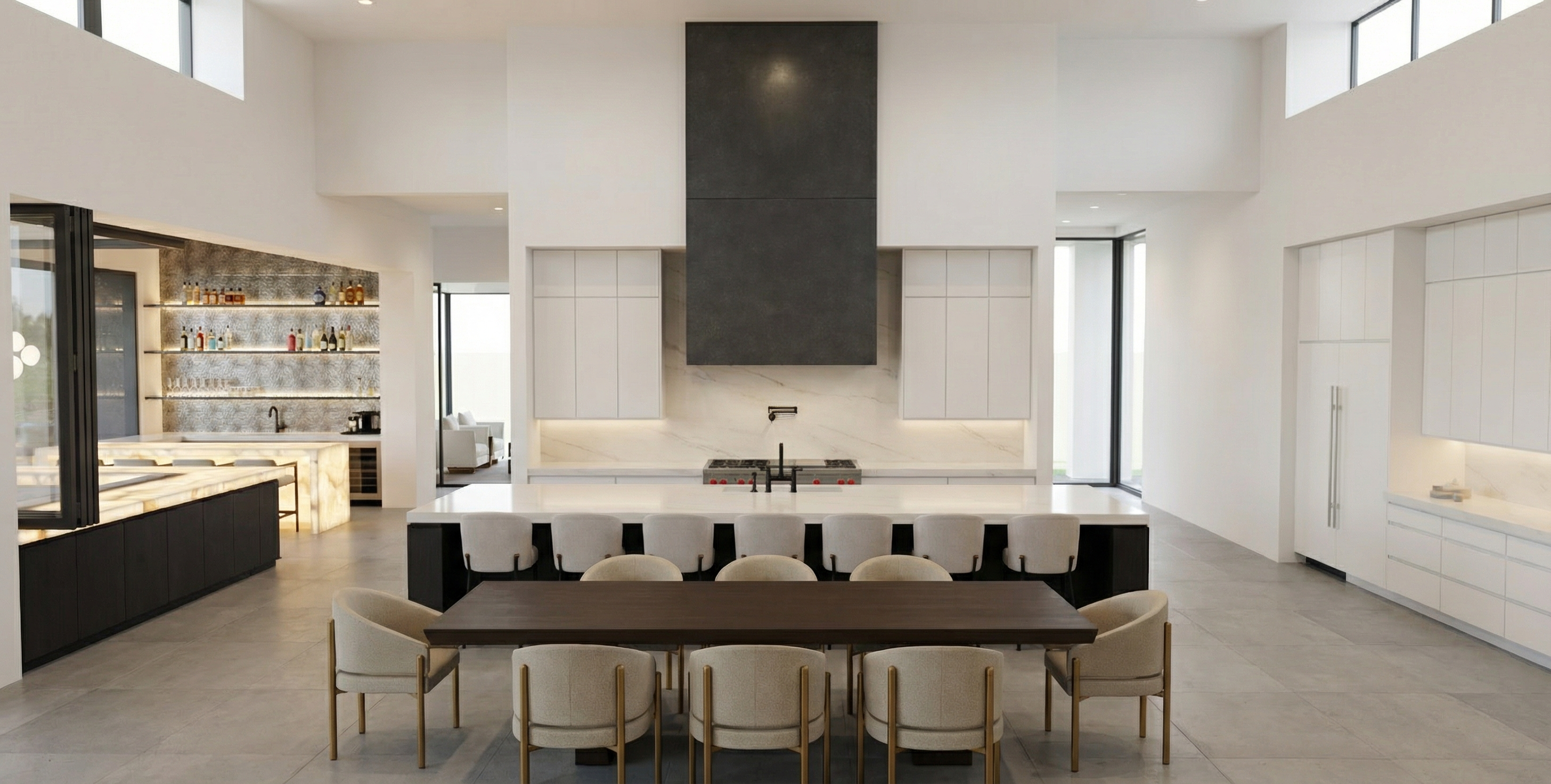 render an ultra modern bar interior with high ceilings include sleek white walls and charcoal cabinets contrasted by a pristine white onyx countertop with soft veining that is backlit a metallic bronze textured backsplash with glass shelves add lighting from ceiling down towards shelves to light the bottles floors are a light grey concrete tile