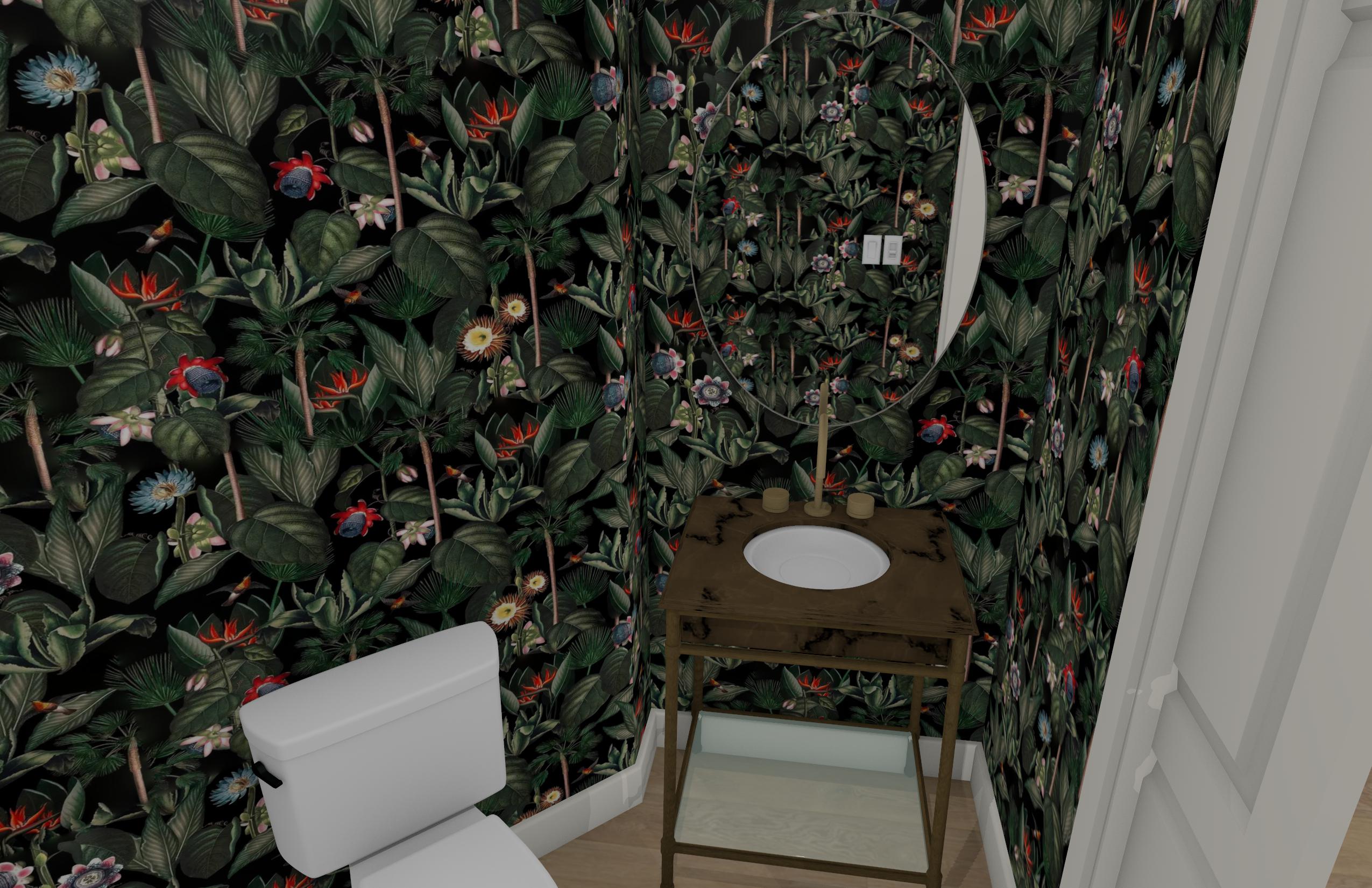 bring subtle life to this rendering of a powder bathroom with neutral warm calm diffuse ambient light from above the scene add a single brass towel ring with a white towel on the right wall make the veining in the brown countertop marble with barely noticeable small white veins