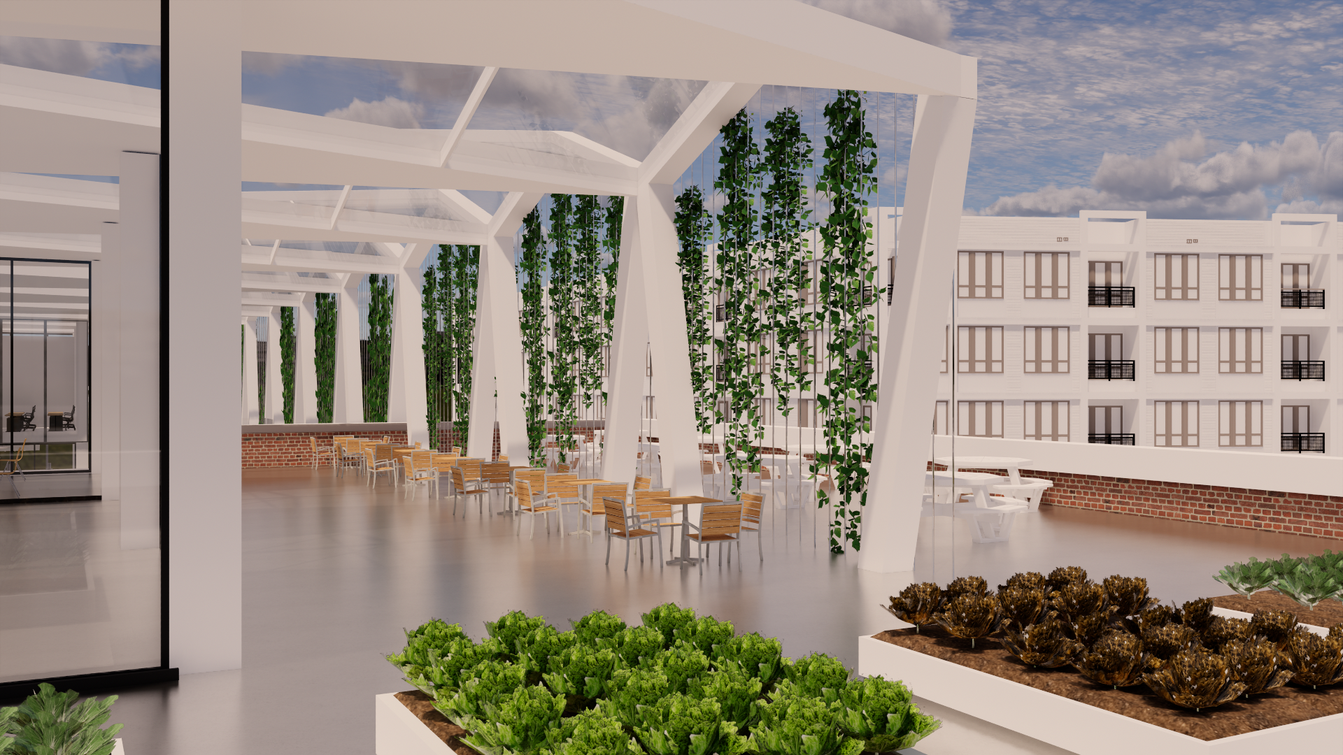 use this image as the base do not change any of the primary architecture keep all white concrete frames roof geometry glass walls brick guardrail floor tables chairs planter locations and camera angle exactly the same background building replace the current brick apartment building with an accurate realistic version of 451 calvert ave alexandria va match its real fa ade light colored cladding correct balcony placement window proportions and overall massing keep the same perspective and height so it feels correctly aligned with the terrace structure materials maintain the existing white concrete frames but slightly enhance realism with subtle surface texture natural color variation and soft shadowing no glossy reflections vines cables keep all vine locations and cable positions the same make the vertical steel cables more visible and realistic and improve the vines with natural leaf shapes thickness and shadows add subtle variety in vine density and leaf size so they don t all look identical planter boxes vegetation keep each planter box in the same position and shape redo the plants to look more realistic with greater variety a mix of leafy greens herbs and low vegetables with slightly different heights colors and growth patterns soil should look rich and textured with believable moisture and shading lighting atmosphere keep the neutral slightly overcast sky no strong blue saturation maintain current light direction but enhance global illumination reflections and depth of field for a highly realistic photographic look do not alter the composition or add new objects focus only on making the background match 451 calvert ave and increasing plant variety and overall realism