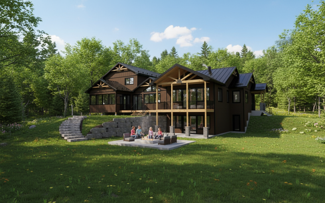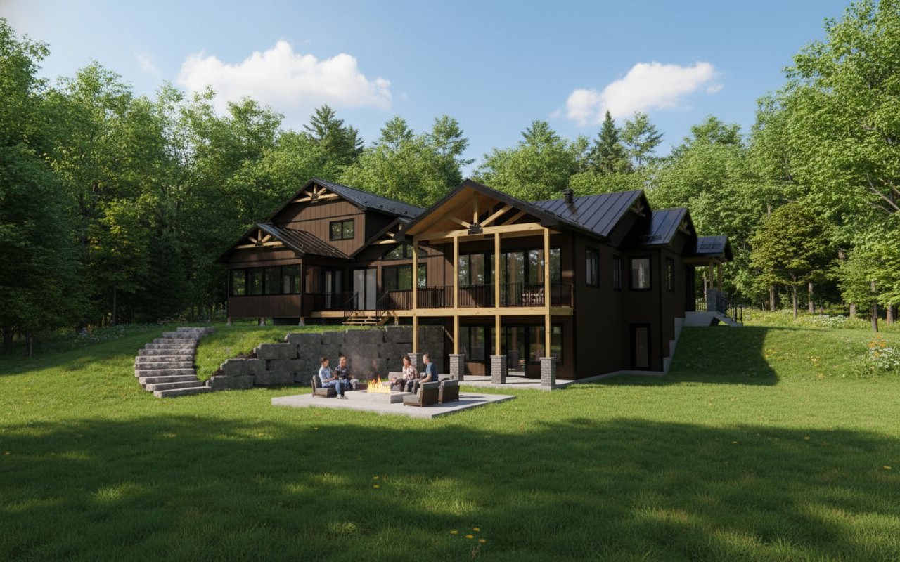 ultra realistic 4k render house in a forest in mont tremblant summer at midday black wooden cladding