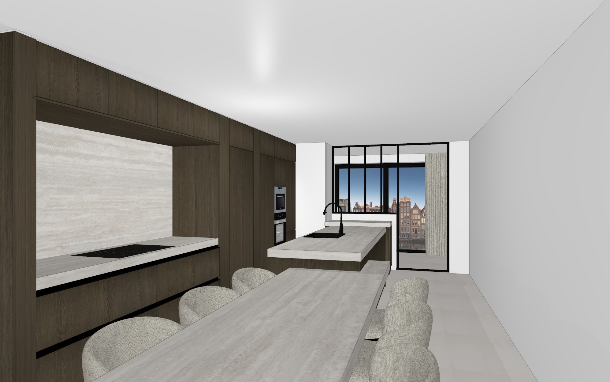 minimal modern japandi kitchen with dark brown oak doors and a travertine thick worktop and table