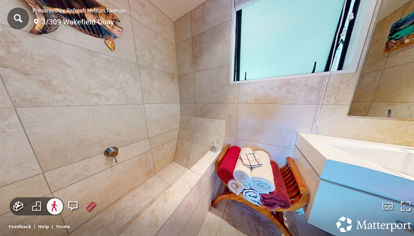 change the tiles on the left of the window to be charcoal coloured with dark grout on the floor on the left of the window make the tiles chalk colour with a light grout