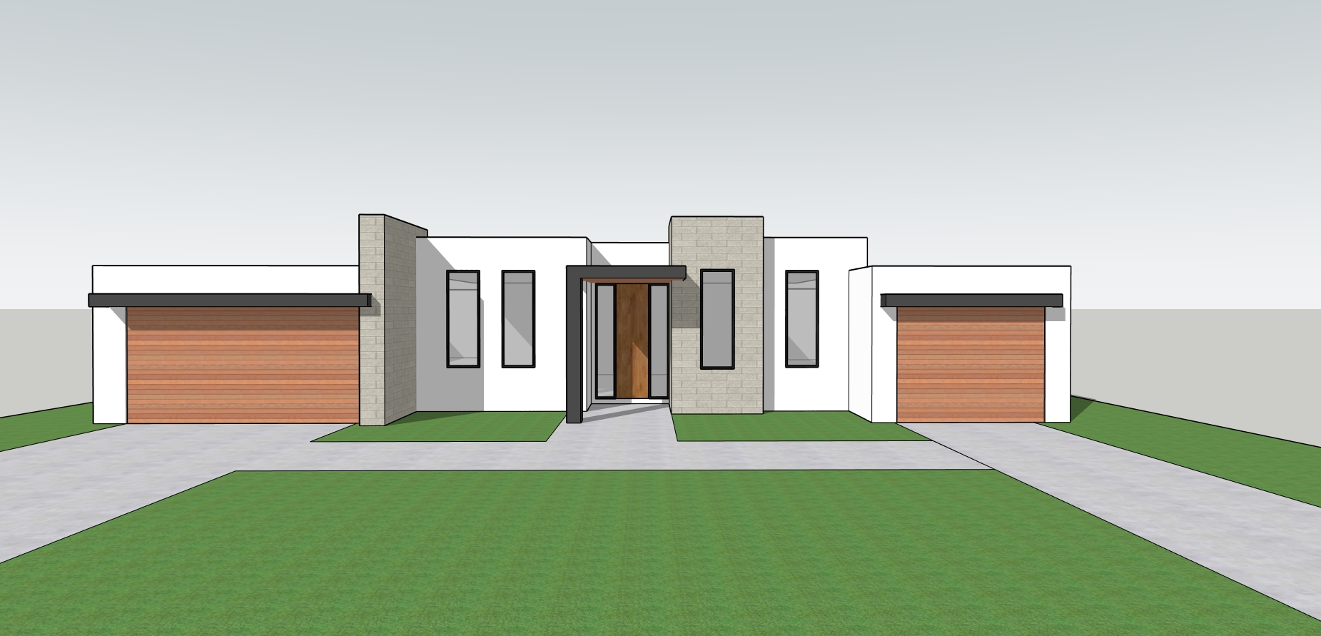 render a modern minimalist one story house with a flat roof the exterior is smooth white stucco with gray concrete accents the main entrance features a wooden door in a rich warm brown hue flanked by large vertical windows with black frames the two garage doors are made of sleek horizontal wooden panels in a light brown color the surrounding landscape is a well manicured lawn in vibrant green with a light gray concrete driveway set the atmosphere to bright daylight with a clear sky creating a fresh and contemporary vibe