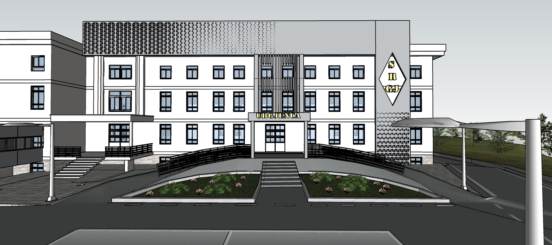 this is a hospital in the city of gjirokastra i want you not to change a single detail of the facility also it should look as real as possible as an image and the lighting should be visible in the logos i have put